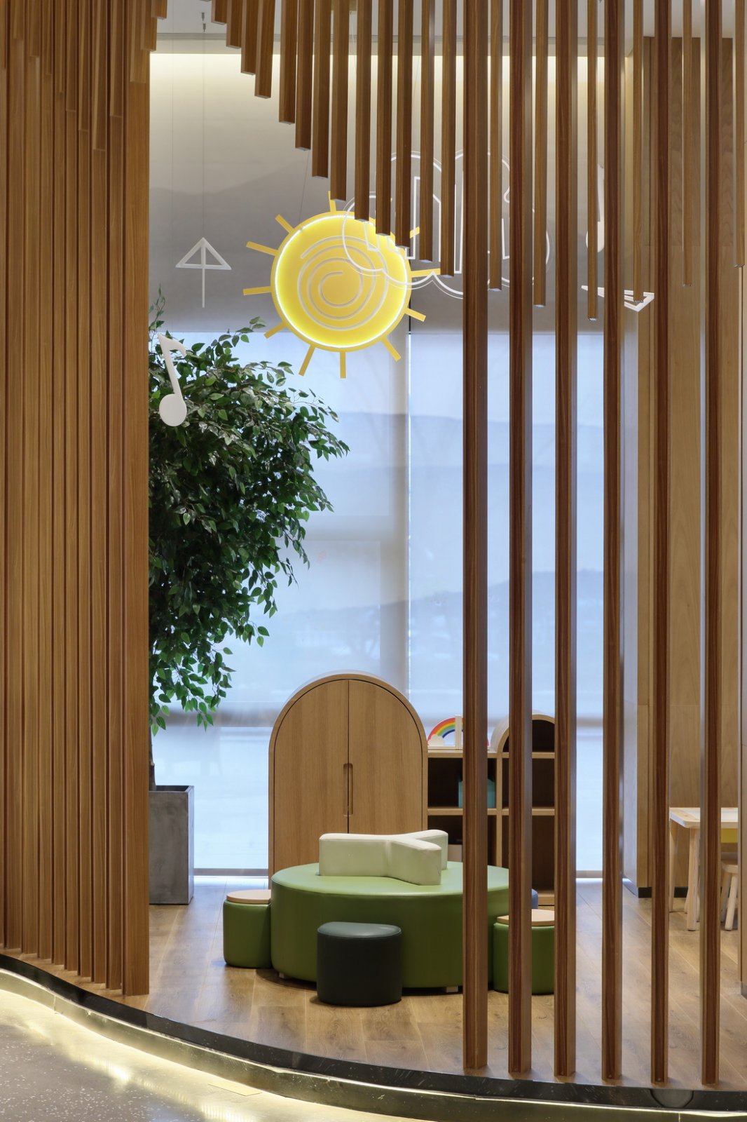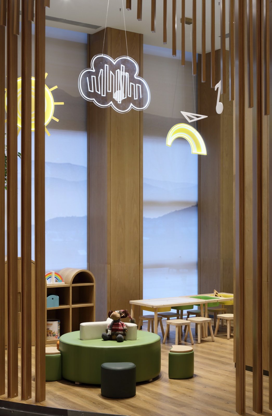 儿童区:空间的色彩材质同样能影响儿童的情绪变化,柔软的、七彩的,给孩子们提供一种庇护感和新奇感。