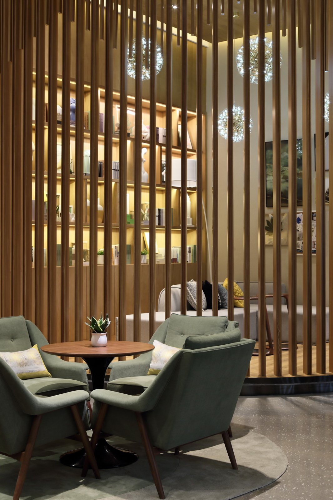 木格栅结构为背景,简单却充满气势。空间开阔后,形成了一个个家具组团,聚拢起适合交流的小氛围。