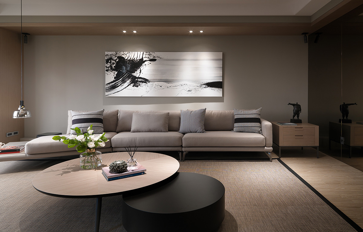 米色系的多人座沙发搭配悬挂黑白泼墨艺术画的灰色沙发背墙,梁下巧妙以木作修饰,勾勒出柔和包覆感;大面积的波龙地毯让屋主一家能轻松地席地而坐,开启放松舒适的居家时光。