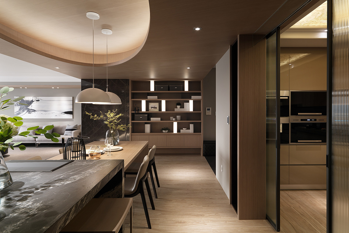 沙发背墙上方的梁下木作一路延伸至餐厅天花板,并在餐桌上方设计圆弧形的造型天花板,圆润曲线打破空间方正格局的局限,为空间增添柔和无压的视觉焦点,打上间接照明后深浅变化的光影赋予丰富立体的空间表情,也形塑出凝聚情感的用餐氛围环境。