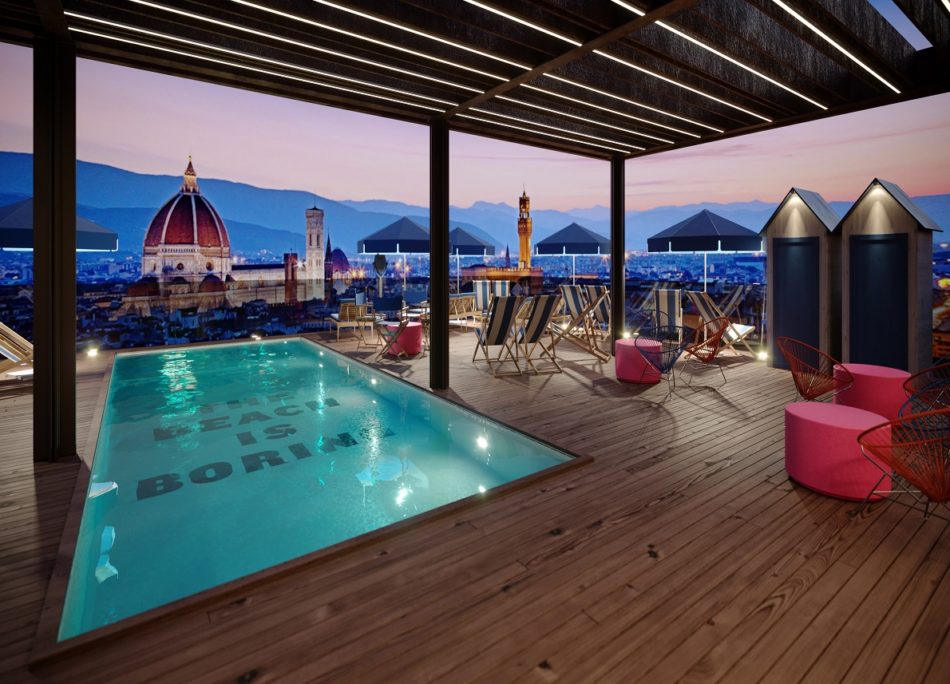 屋顶游泳池和露台以柔和的木质色调营造出宽阔的佛罗伦萨全景。在这里,通过整合露台天花板和池畔甲板的色调实现美学统一。天花板结构看起来像风化钢,几乎可以看作是下面甲板的反射。这种效果令人愉悦地强调了空间的水平状态,同时将托斯卡纳的景观构思出来。