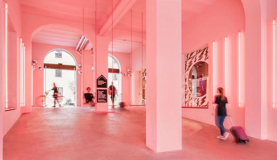 在托斯卡纳首府佛罗伦萨的心脏附近,Rizoma Architetture为学生酒店(Student Hotel)品牌设计了一个色彩鲜明、活泼有趣的室内空间。在街上,淡淡的粉红色光芒标志着佛罗伦萨学生酒店首次确立其存在的地方。走进新酒店的拱廊,霓虹灯的色彩更加强烈。通过邻近的庭院,装饰图形引导人们来到前台,大胆的纯色、对角图案和霓虹灯照明元素相互作用,创造出强烈的空间感。
