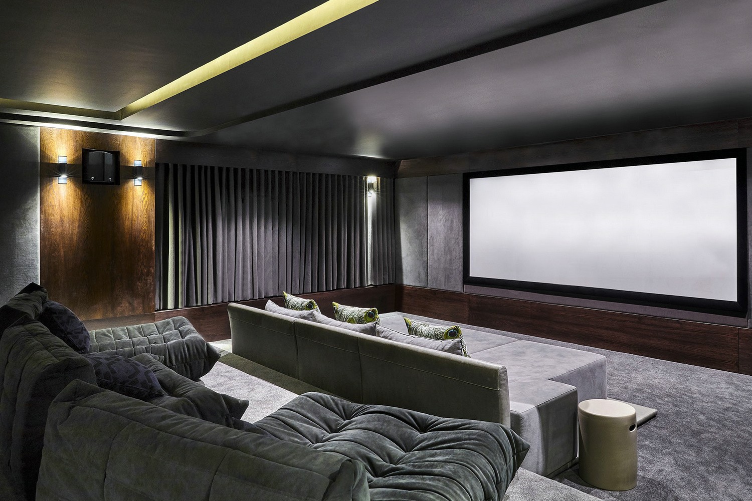 在凛冽的冬日里,地下室的家庭影院便成为了最受欢迎的家庭活动空间。这里配有大量的舒适的灰色躺椅、沙发和坐卧两用的长椅,可以举办全天式的电影盛会。雪茄室兼酒窖同样诱人,其桶形穹隆状的天花板和板形的混凝土饰面扩大了这个茧状空间的视觉效果,营造出一种超凡脱俗的空间氛围。由OKHA提供的Stix咖啡桌是桶形天花板在形状和材料上的延伸,其圆形的形状模仿了圆形的地毯,在拱形顶部下方创造出一个视觉焦点。