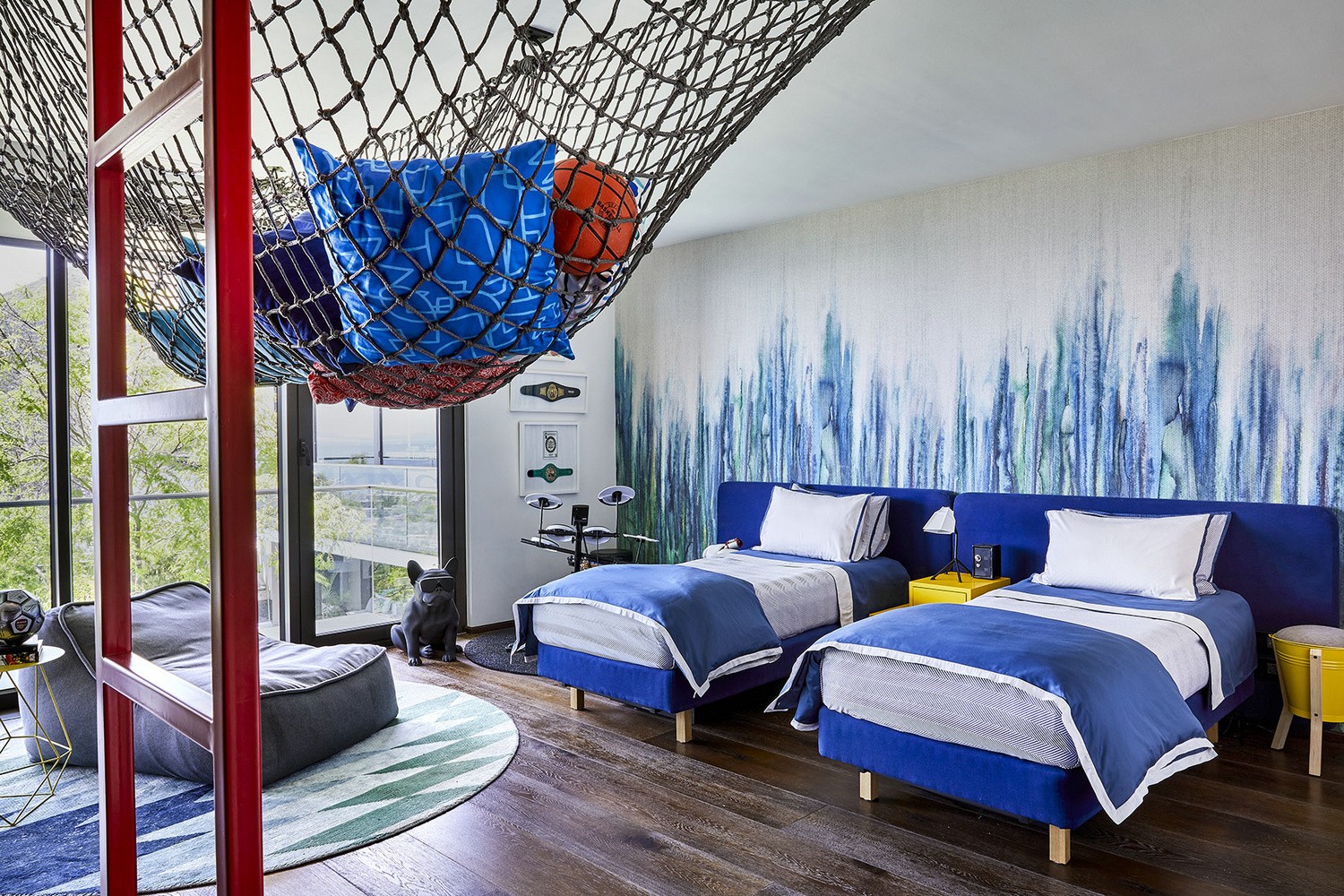为了符合住户的期望,建筑师对上层空间中卧室的室内空间进行了精心的设计。在儿童卧室的设计中,我们采用了非常醒目的原色色调和渲染式墙面,辅以吊床和桶凳等俏皮的元素,增强了空间的新鲜感。
