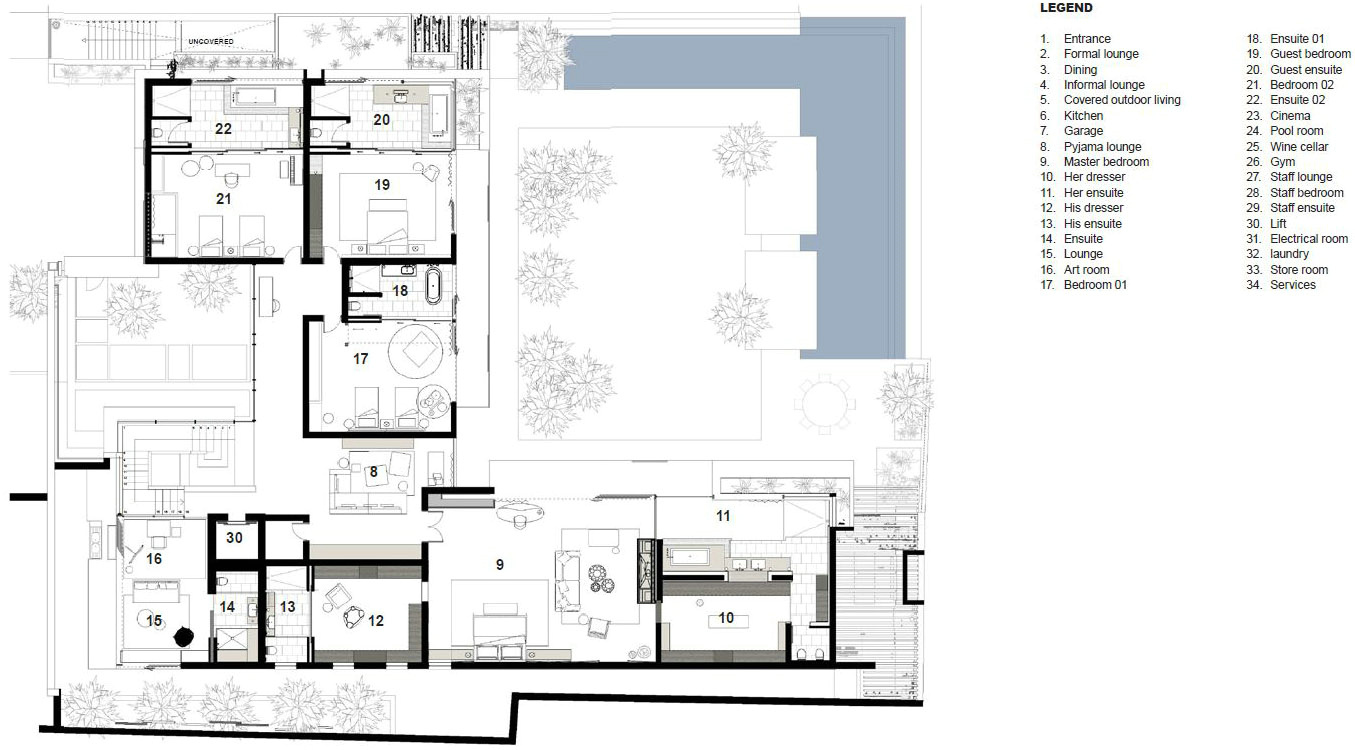 带顶棚的露台俯瞰着被草地包围着的泳池,成为休闲娱乐区的自然延伸。露台空间内设置壁炉、烧烤架和比萨烤箱,创造出一个光影斑驳的室外空间,为住户提供了一个可以轻松悠闲地享受露天活动的场地。冷灰色的混凝土楼板通过天然的石材镶板块,与较暗的炭灰色墙体相适应。一些喷砂的石灰华和预制混凝土后设置背光,当夜幕降临的时候,整个空间幽静地散发出光芒,营造出一种淡漠的氛围