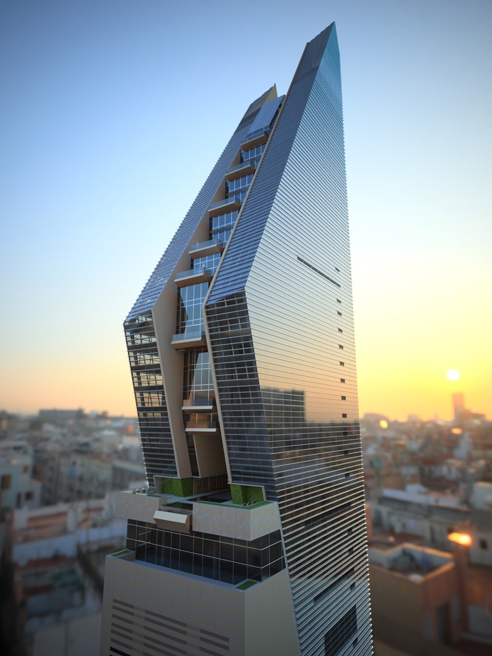 建筑倾斜造型不仅体现文化特征,而且随着建筑高度的上升,打造了露台、逐层缩小的楼板和可供入驻的独特空间。两个互相连通的高层结构汇聚在一起以塑造一个中央中庭,比起传统意义上的中庭,这更是一个垂直的室内花园空间,布置绿意葱茏的立体景观和迷人的室内瀑布,犹如泰国著名的山洞,营造令人流连忘返的体验。