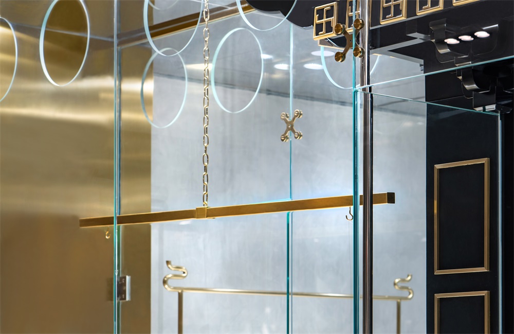 道具设计橱窗道具:橱窗中的方墩使用了非传统中式风格的镜面不锈钢材质,以传统的水纹图案进行全手工的拉丝处理加以中和风格的现代感。方墩高度同时考虑到店内人员更换橱窗展示服装时更为方便。