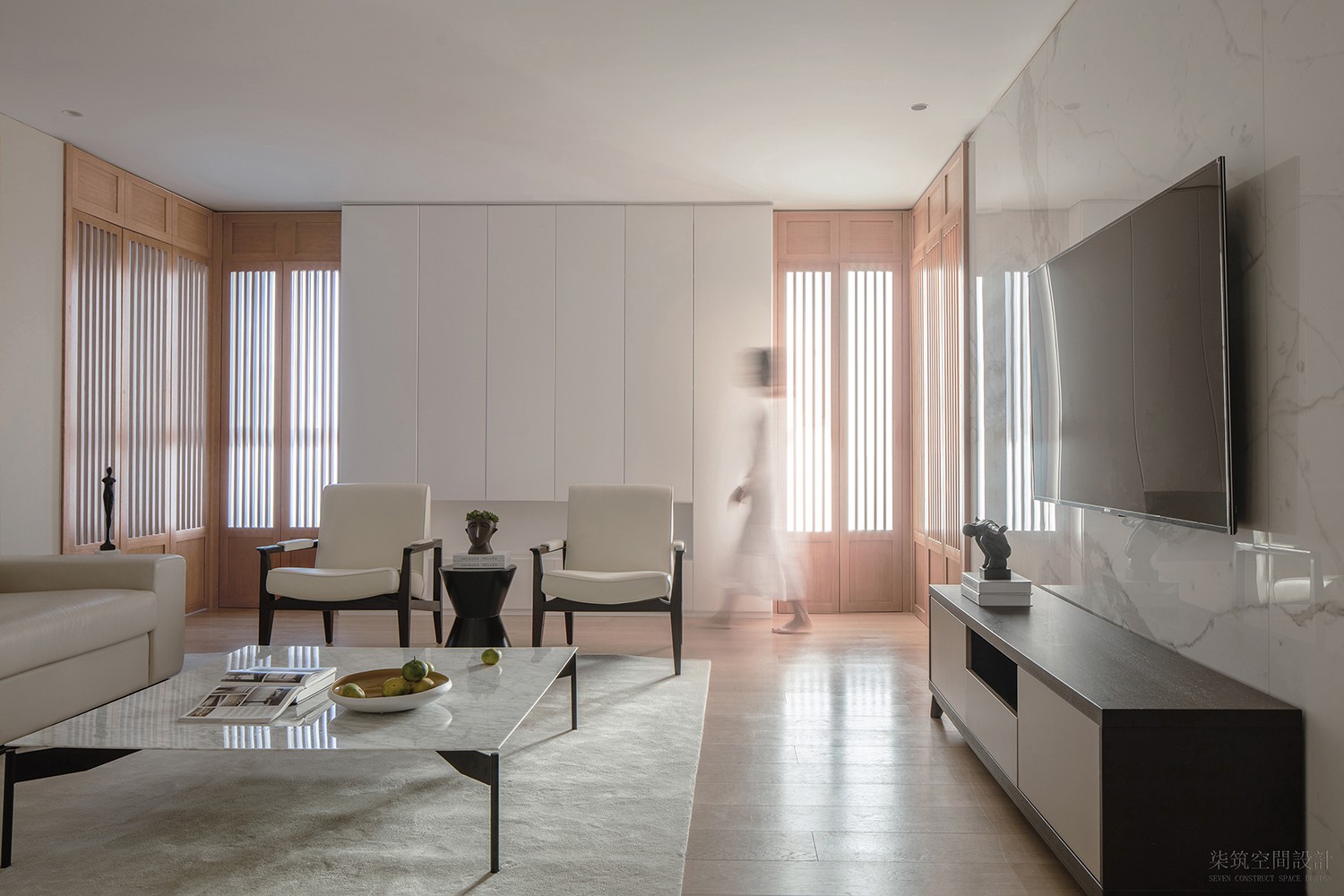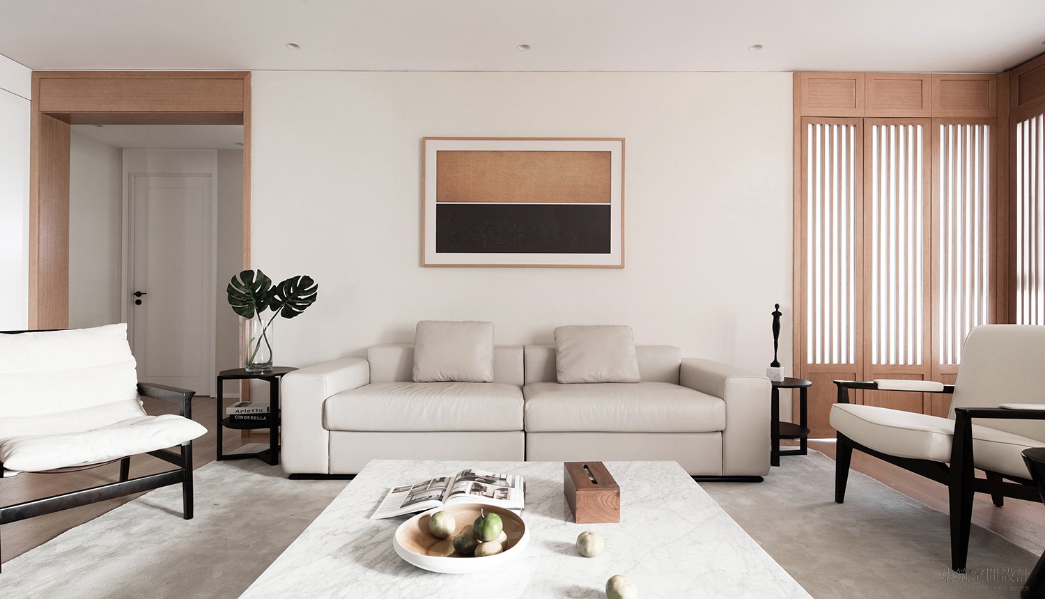 本案的色调以暖色调为主,大面积采用了米色系的艺术漆,部分格栅门采用了橡木,剩下就是采用白色的柜门。没有太多繁杂的材质和色调显得尤为温文尔雅,客厅背景采用简洁明了的鱼肚白,细腻低调。木头和石材的刚柔并济,在空间里达到了微妙的平衡。