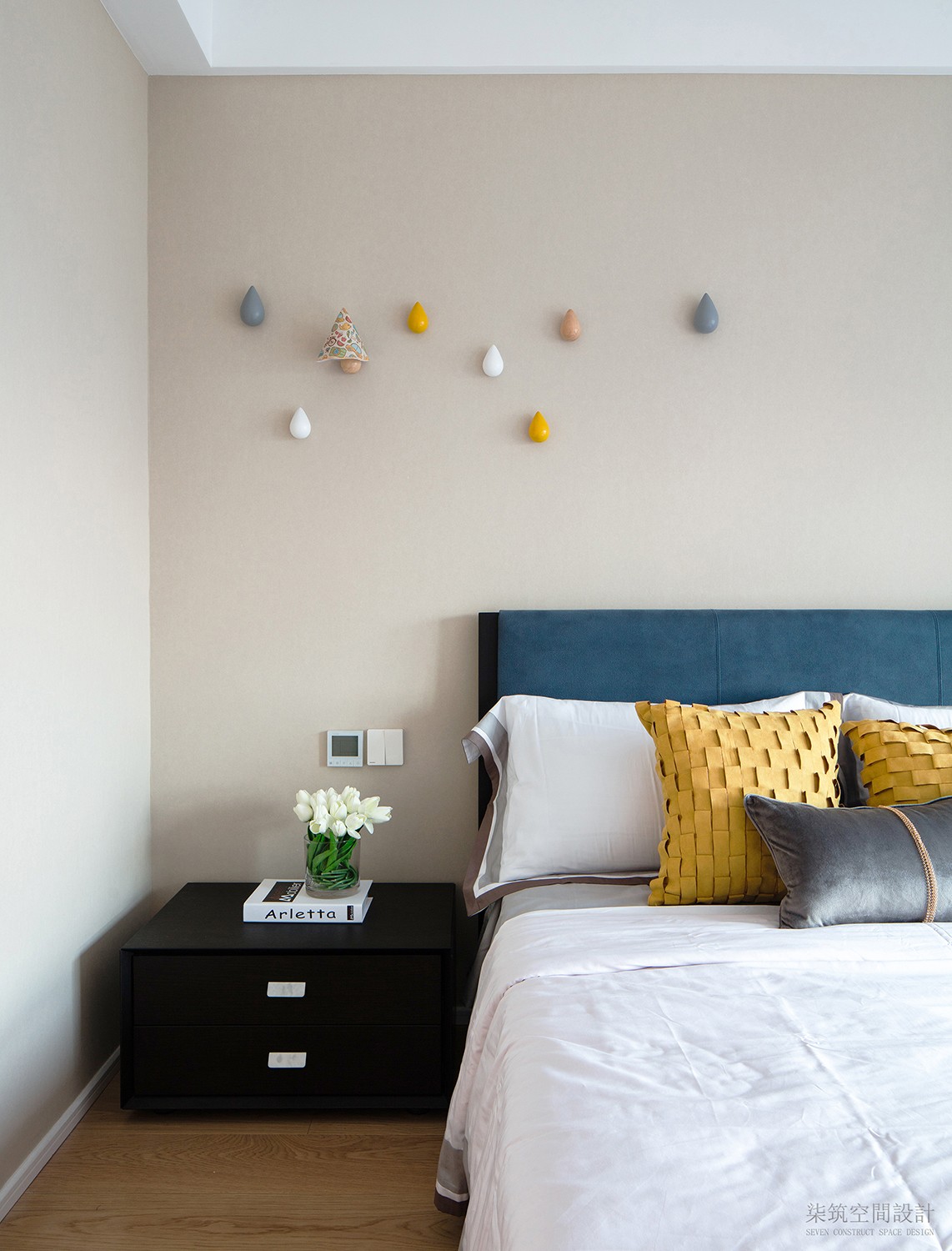 儿童房的整体的色调,特别的简约,黄色白色灰色的挂钩充满了童趣和跳动,在墙面显得趣意盎然,能给于孩子充满一个纯净天真的空间。