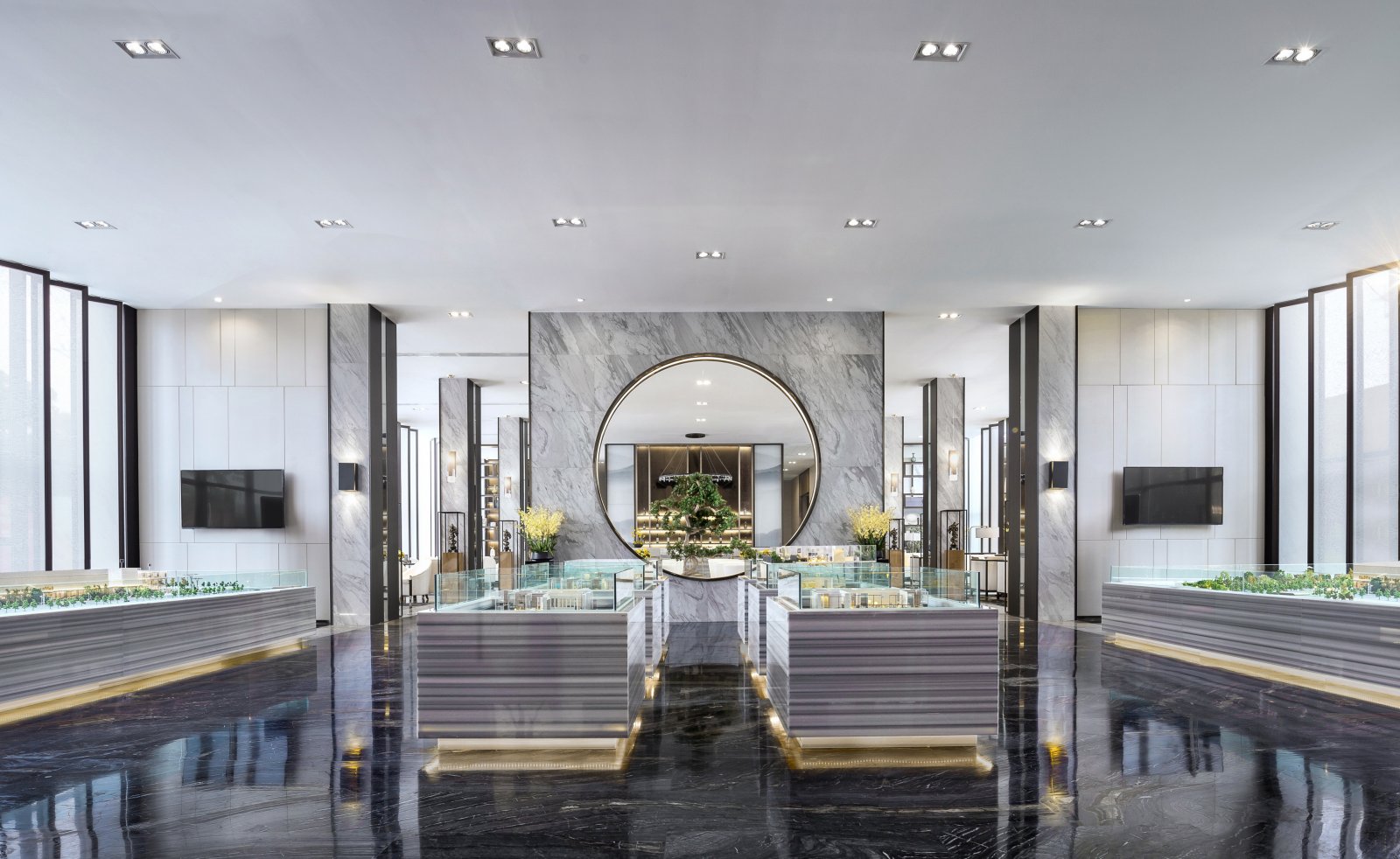 步入中庭,设计团队对空间的操纵不容小觑,大厅格局方正可见,上升空间的格栅线条将目光向上引去,涟漪纹路集中收拢,又顺着水滴纹吊灯直落而下,坠入到沙盘,发散而开,大理石地面光圈浅浅,余晖荡漾。