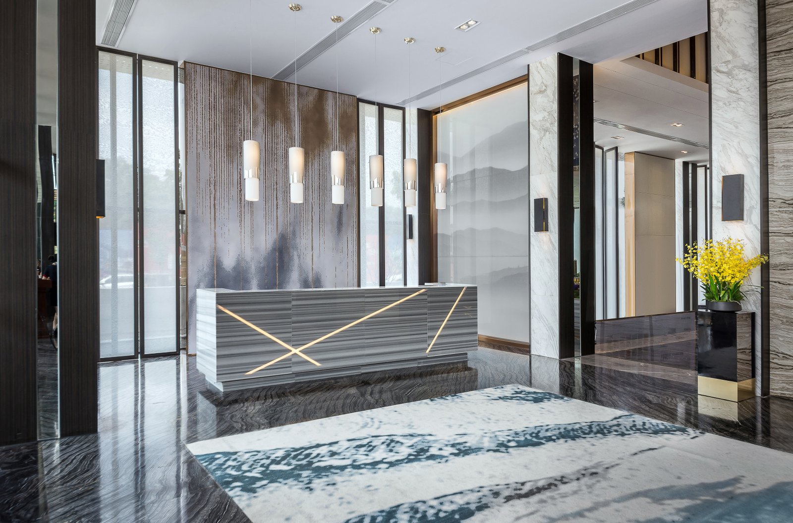 自左延伸,接待处山水背景板自屏风跳出,排列吊灯垂落而下,在接待石台的框架上纵向突破,一方格局悄然自成,格调优雅,重塑大堂的视觉重点。