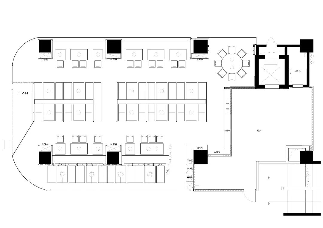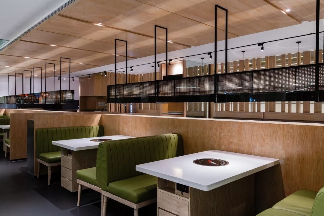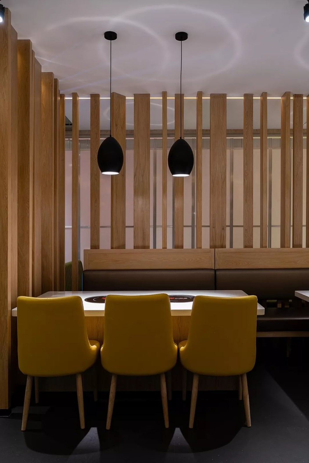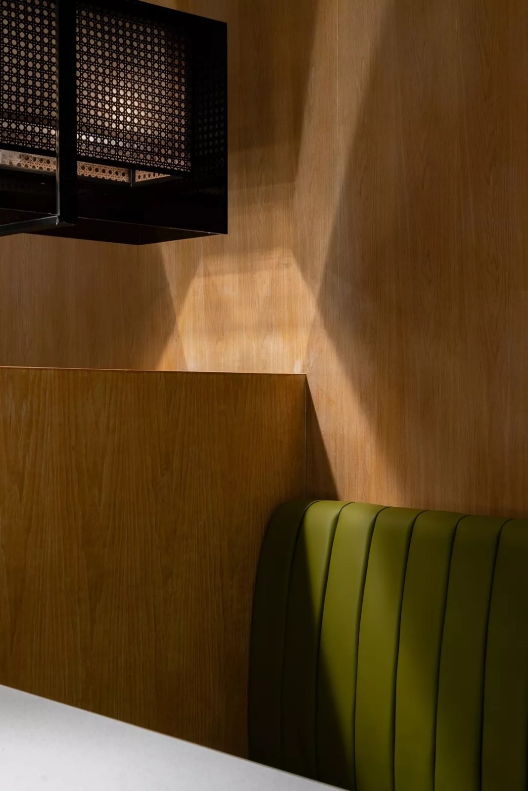 餐厅的外围被弧形玻璃包围,内部的用餐气氛能被外面路上的人感受到,呈现出非常开放的空间状态。不追求第一眼的惊艳,在深思熟虑后,将至繁归于至简。干净的线条、中性的材料给经济时代争奇斗艳的餐饮设计吹入一股清新之风。