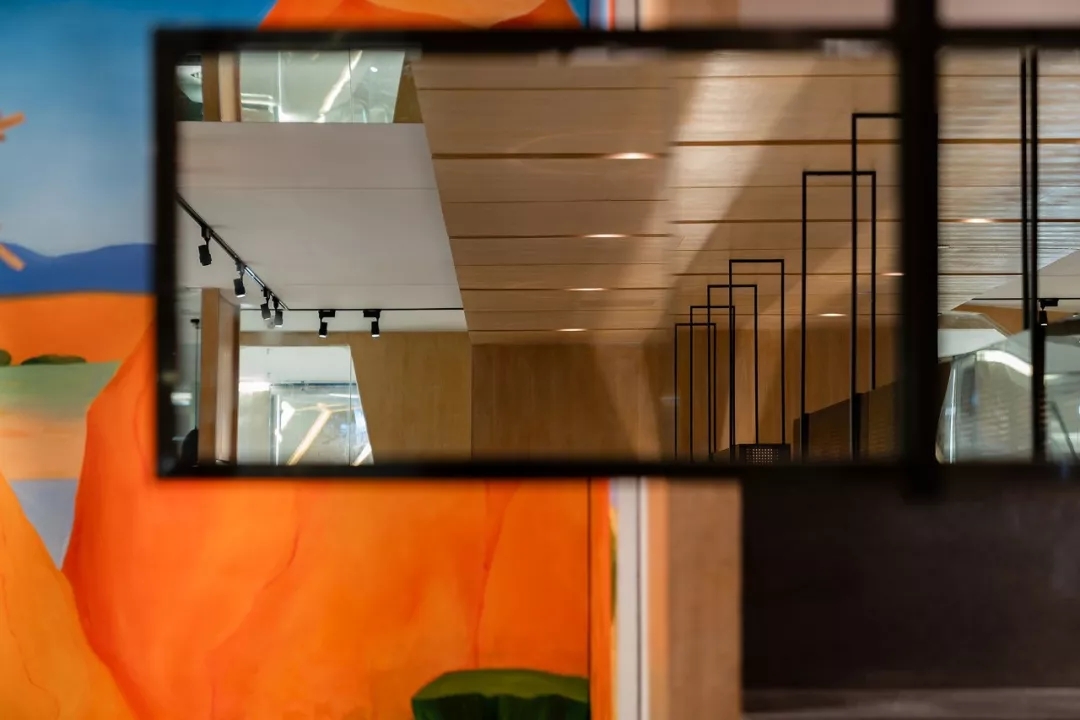 从餐厅入口到出餐口通过一条长形竹编装置吊灯联系起来,解决照明和隔断不同高度的视线。端景的装饰画刺激客人的视觉和味觉。