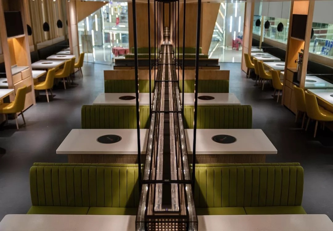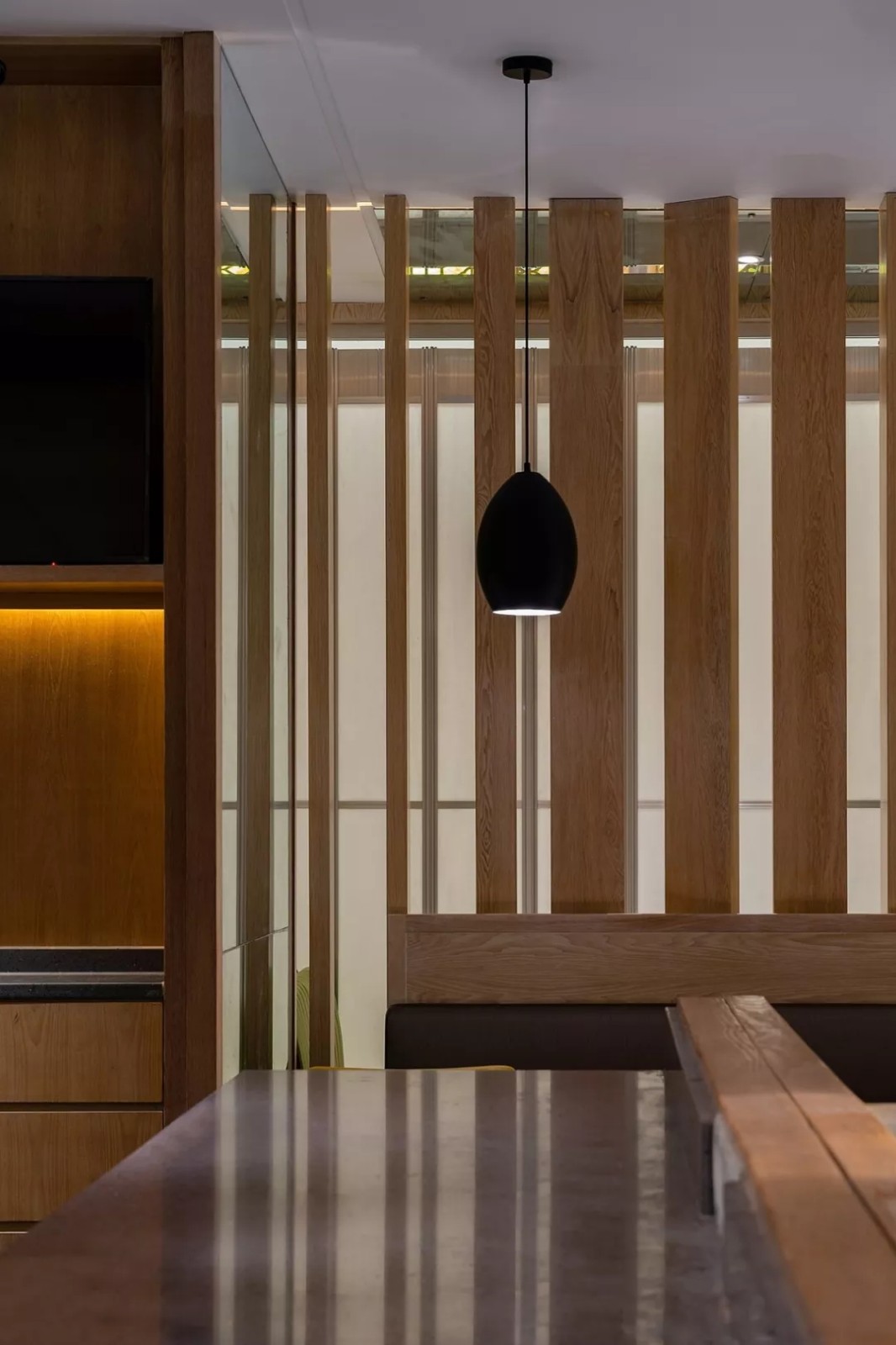 玻璃不仅仅是一种透明的材料,也应该能不断反映周围的环境。利用柱子把备餐区和用餐区完全分离,镜面材料消弱柱子的体量,延伸视觉空间。