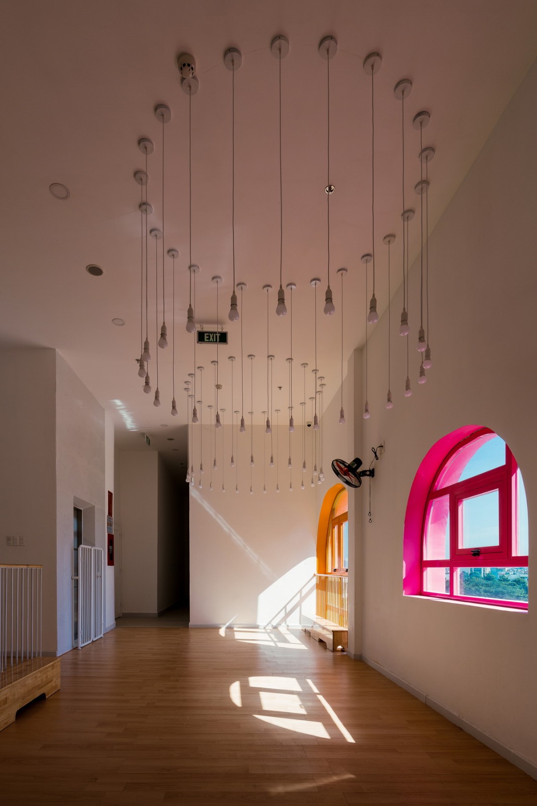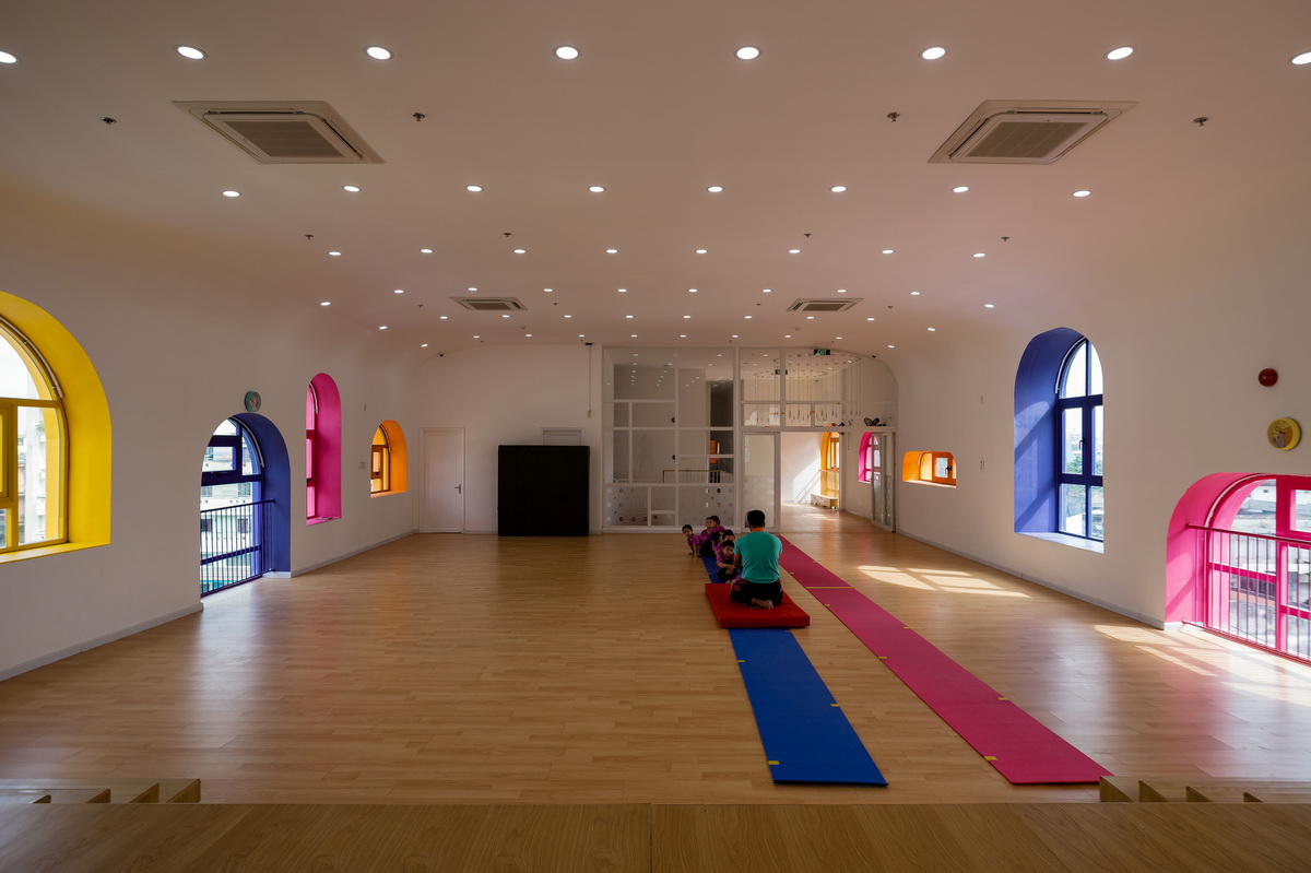 窗户就是一个孔洞,可以从里面看到外面的风景,这样可以激发孩子们的情感思维、想象力和好奇心,让在室内玩耍的孩子和不断变化的外部生活环境之间建立起直接的关系。光线透过这些窗户可以沿着彩色的窗台流动,就像染色的色彩流淌在室内空间里,营造出一种迷人而又童话般的氛围。