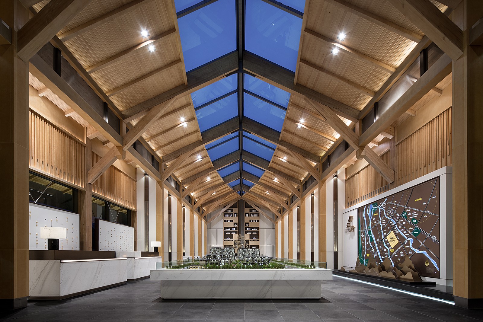 从室外平台步入室内,目之所及层次井然。从前厅过渡到沙盘区,映入眼帘的是一览无余的恢弘空间,挑高空间中不可忽视的视觉焦点无疑是天花上的梭型天窗,由室外延至室内,如一叶扁舟亦激荡起人们对于自然苍穹的仰望神往。