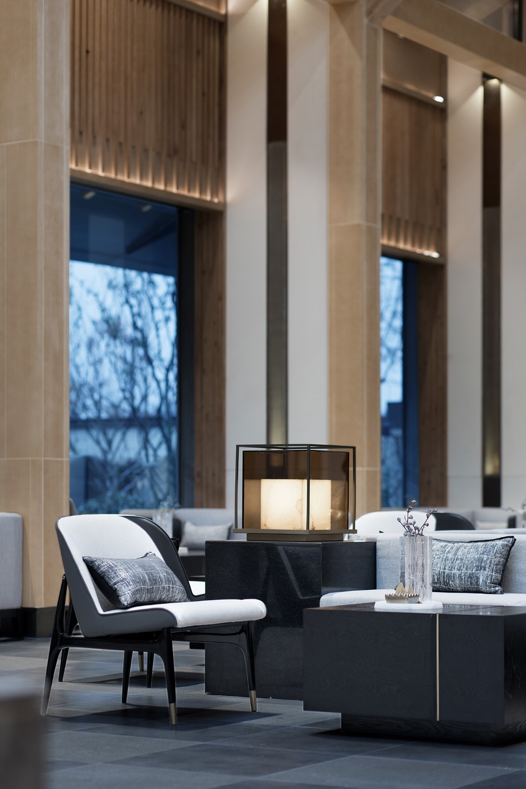 中国传统文化里讲求造物的对称美,对称给人一种"安静"的严肃感,蕴含着平衡、稳定之美。从建筑外形到室内空间,对称之美贯穿其中,尽显素雅之境。从墙面到天花、从灯饰到座椅,阵列皆成双,亦有美感上的虚实、明暗对比。
