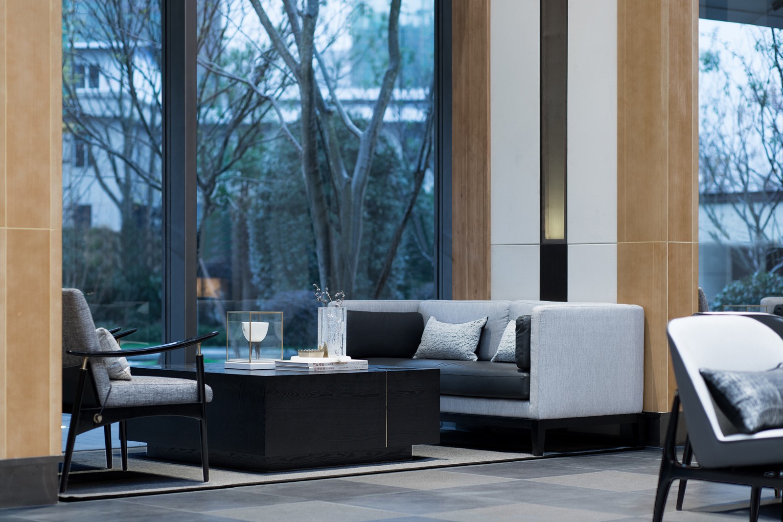 "通过大面积的玻璃幕墙观看室外的景色,比在室外看自然景色有着更深刻的意义。"洽谈区营造了一处轻松、写意的交流氛围,落地窗将山色、树影、轻雾尽收其中,沙发的阵列摆放让空间有条不紊,穿插的艺术装置则呼应了园林景观的山水意境,让身处其间的人们感受到一份宁静的淡雅和沉淀的安然。