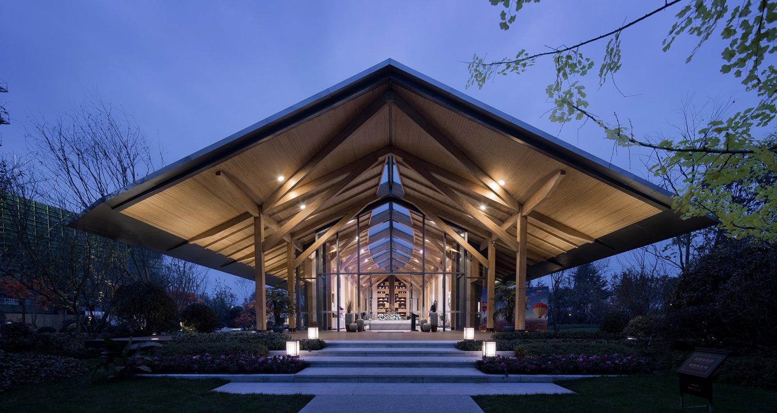 都江府销售中心受中国传统木建筑结构启发,建筑主体将木结构、现代工业以及现代人的功能需求做了耦合,以一种简单谦逊温和的姿态立于大地,倾听山语。园林以水之势布局,写意枯山水优雅静谧。形似川西民居的双坡顶建筑有一种视觉上的轻盈感和亲和力,中国传统建筑空间所注重的室内外的相互渗透和交融,让置身其中的人感受到宅与院,室与景是一个不可分割的整体。