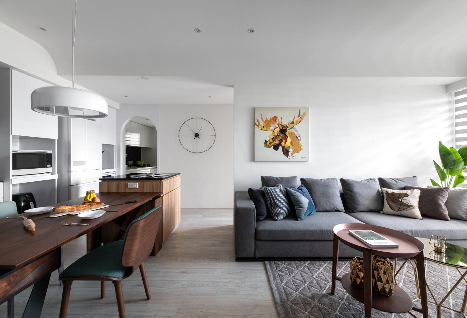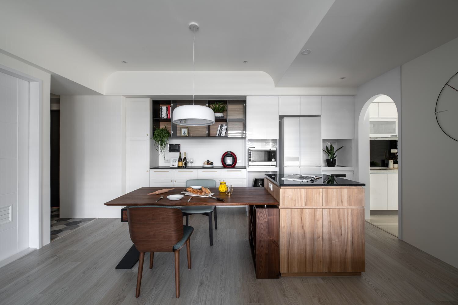 这次在许多空间中的天花板中使用弧形方式呈现,工法上难度高且费工,但圆弧形的天花板除了是界定场域的隐晦方式,同时能转换居家空间的生硬氛围,将整体轮廓修饰地更为柔和。