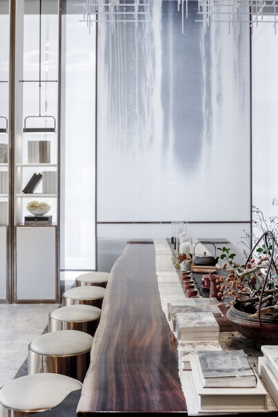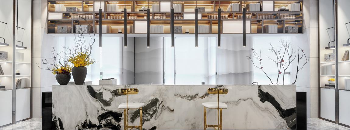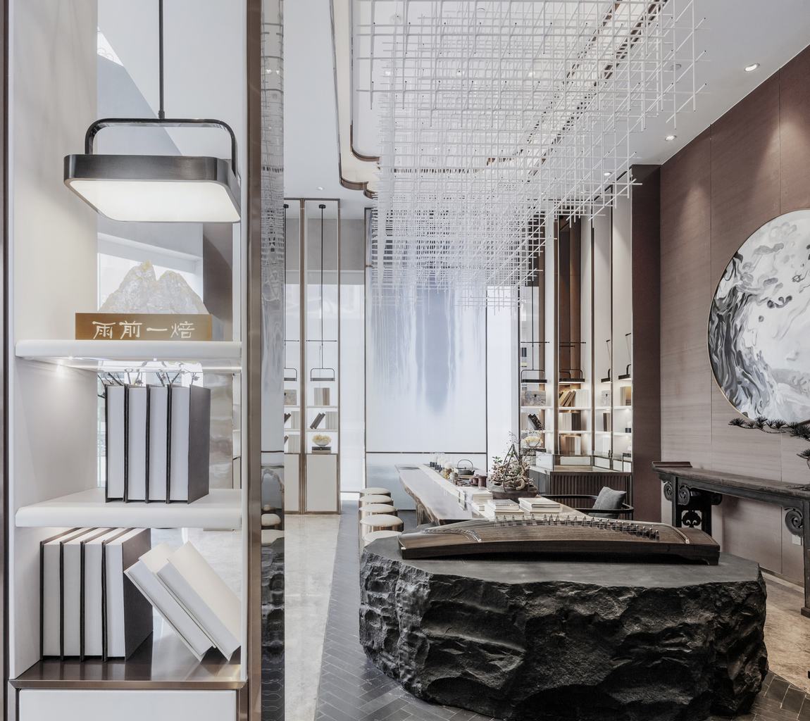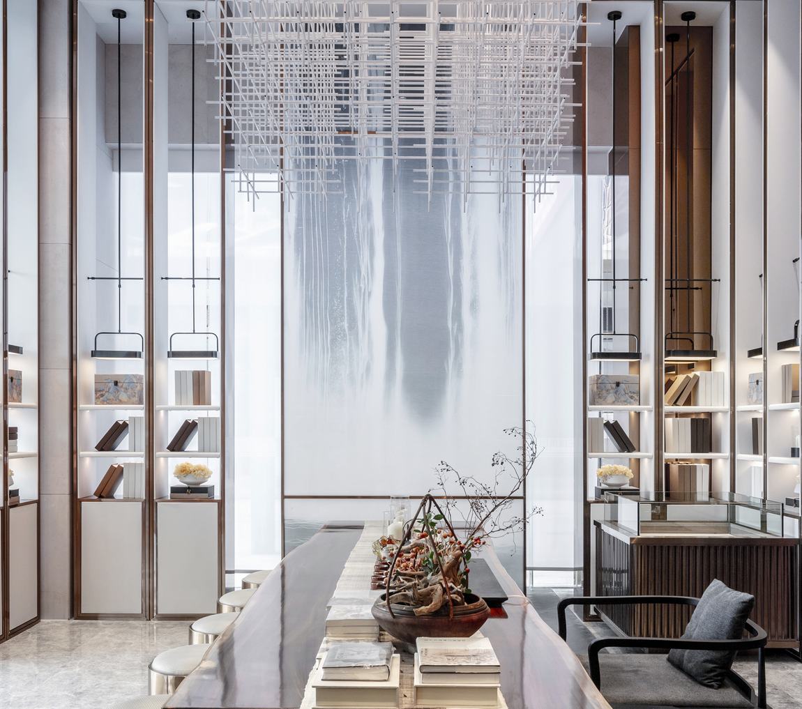“月出惊山鸟,时鸣春涧中。” 设计不以繁为美,恰到好处的线条,极具东方感的设色,加之柔煦的灯光,营造出悠远空灵的中式意境,尘嚣俱抛。