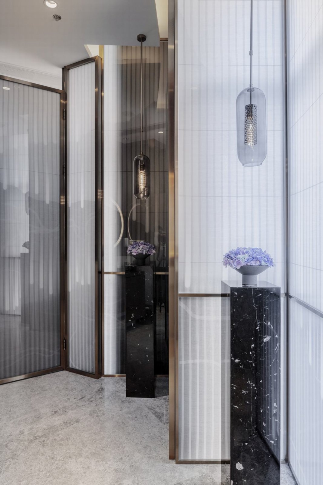 “屏掩数峰临峭绝,蛇蟠一径入幽深。” 前厅容仪端然,素雅屏风留白缥缈,温润的金属格栅天花铺陈有致,叠石端景工笔雅澹......无一不传达着空间清幽有序的韵致。