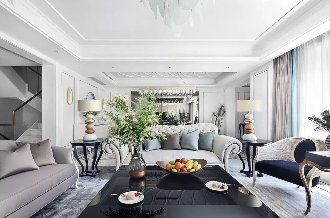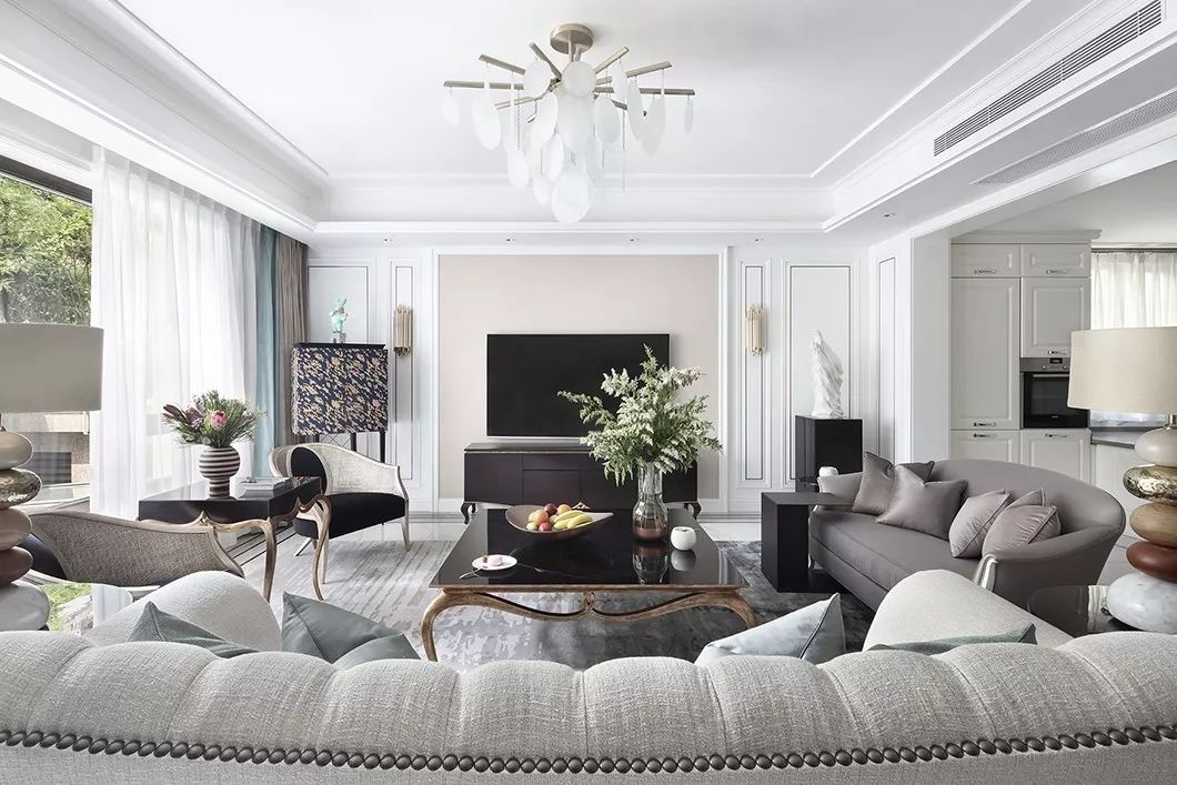 客厅采用经典的黑白灰作为背景色,低调内敛,在含蓄中表达着对品质与细节的追求。