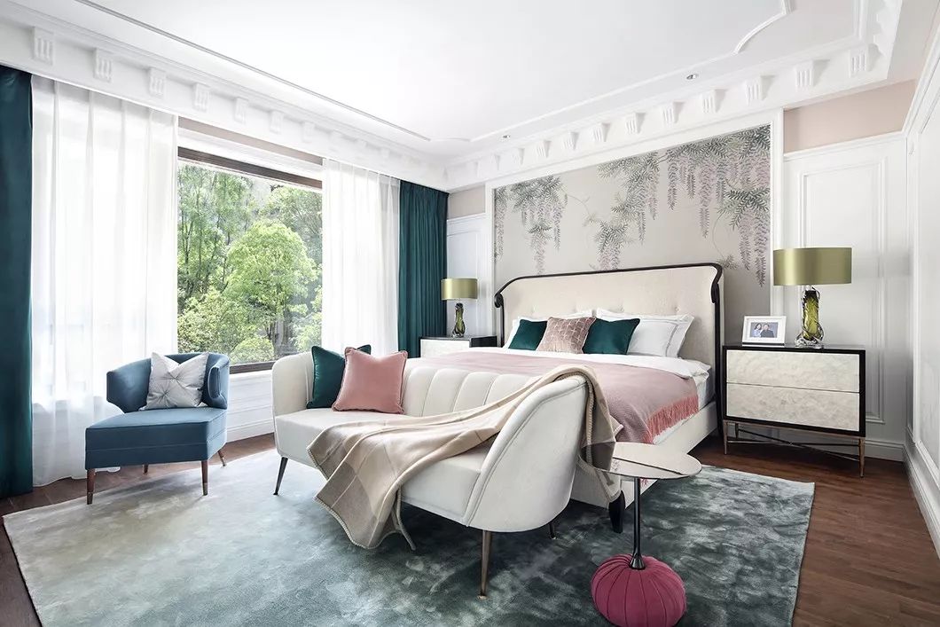 主卧,色彩浪漫恬淡,清新可人,营造出宁谧自然的氛围,温柔熨帖,又慵懒随性,墙面上垂泻下来的紫藤萝瀑布,像一个浪漫甜蜜的紫色梦境。