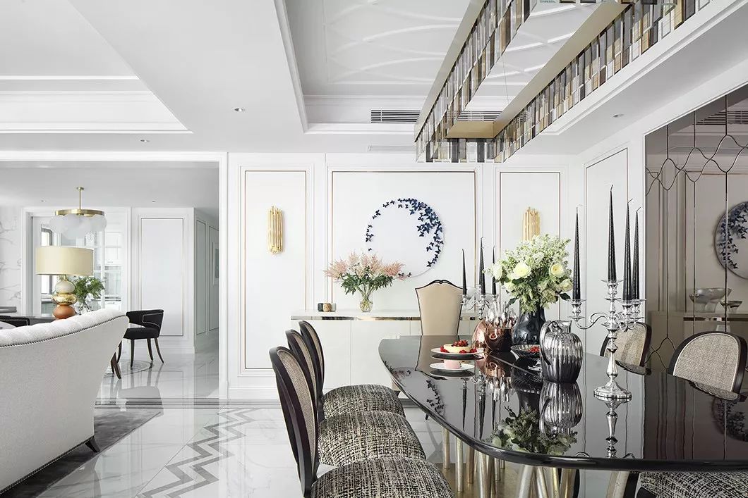 开敞明亮的餐厅以餐桌椅纤细优雅的线条,中和了空间的庄重感,使之不过于沉滞,多了几丝温软清逸的气息。天花板的鱼形纹与餐椅相呼应,婉曲相叠间,与地上的水波纹交织在一起,灵动多姿。