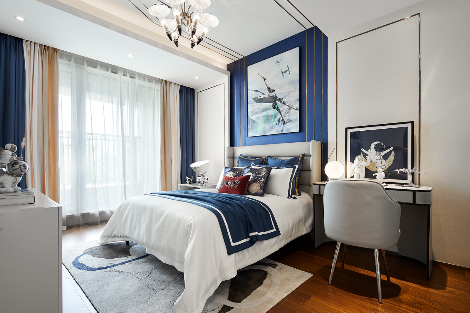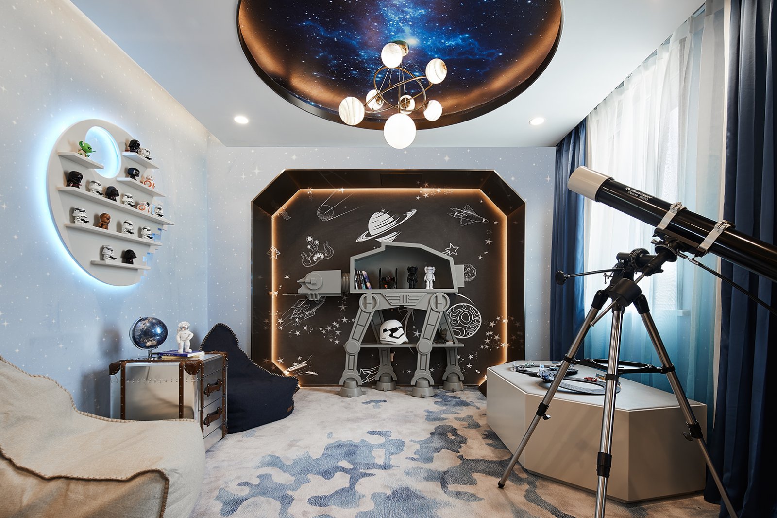 以星球大战为题,以梦幻的色系、壁纸、灯饰、家居,环绕整个空间,给予孩童时期的无限遐想,舒适的沙发,精致的手办,让整个氛围置身在辽阔的外太空。