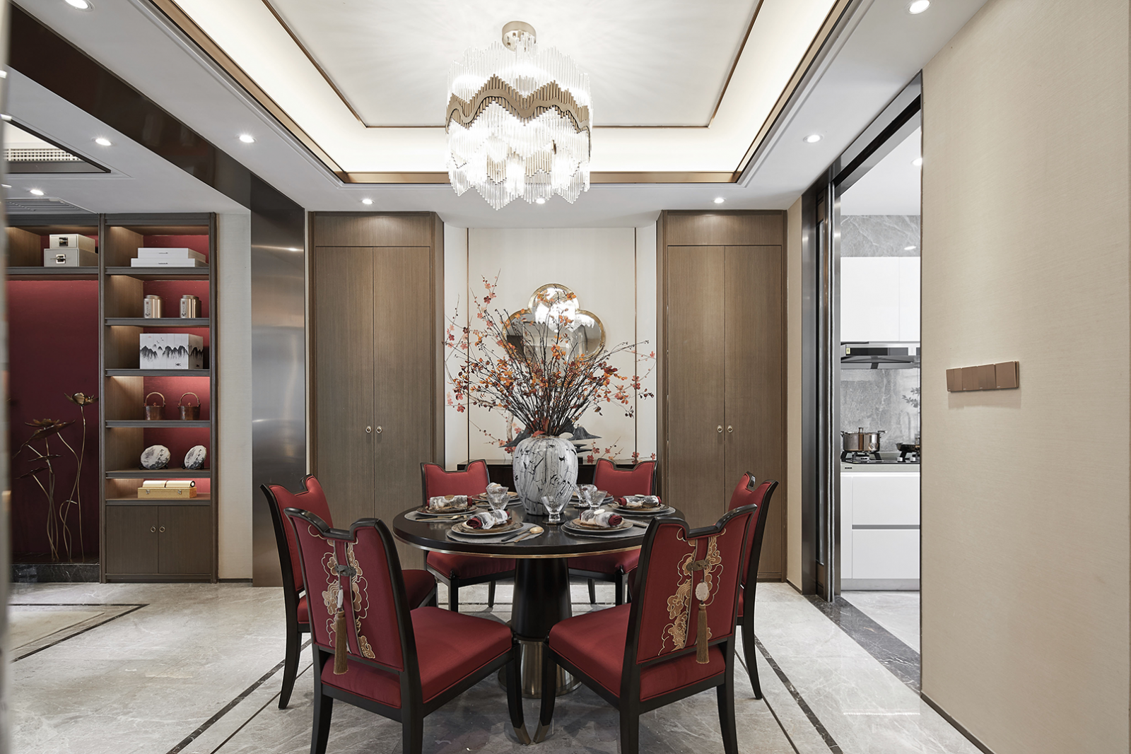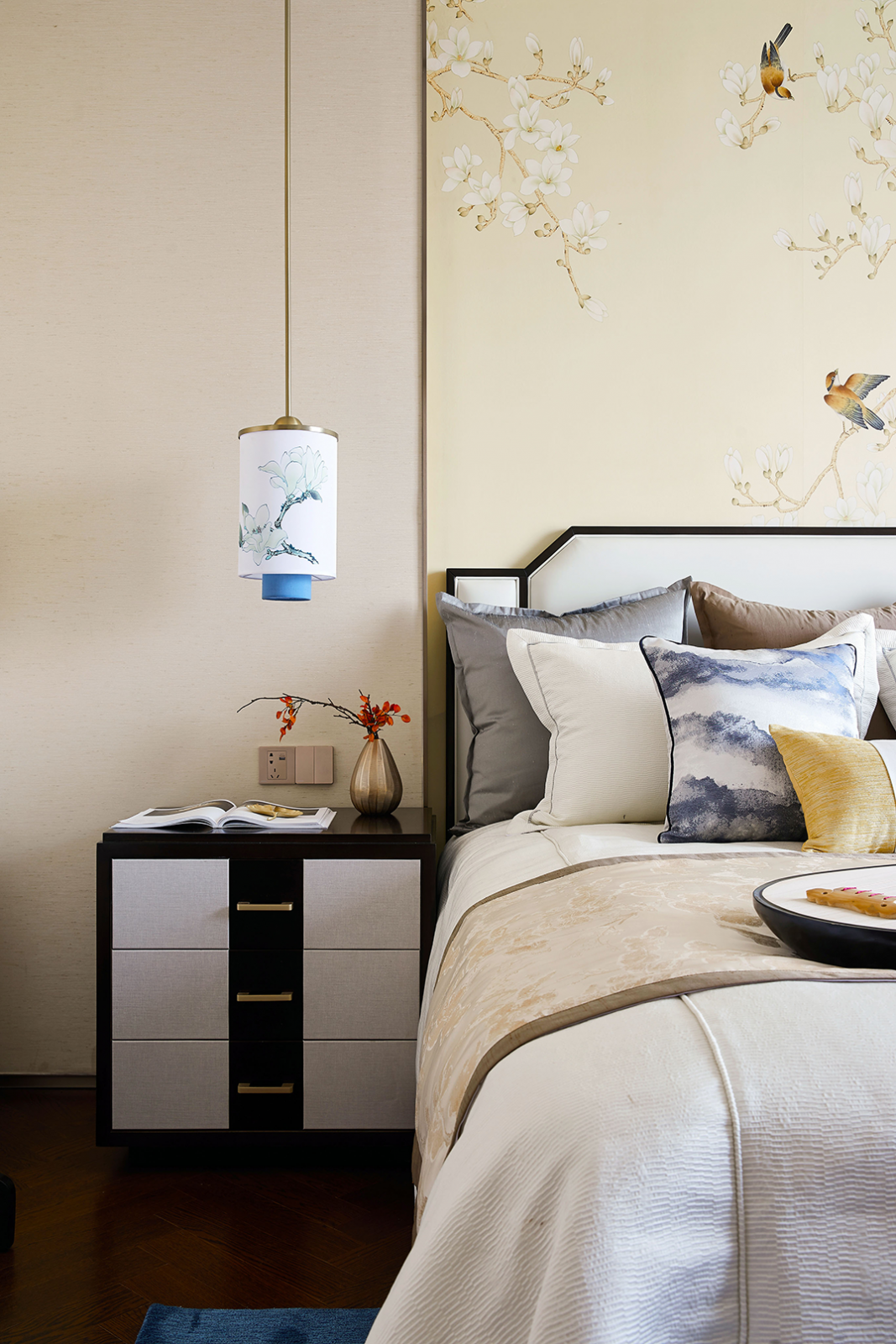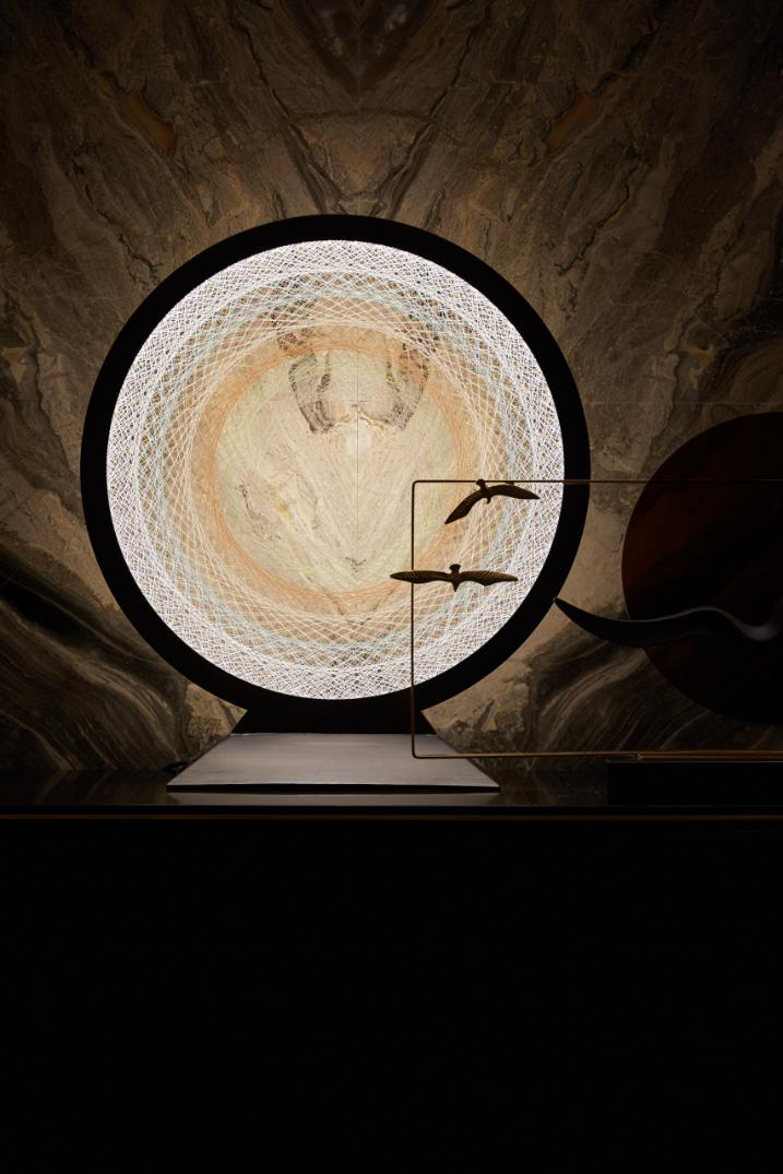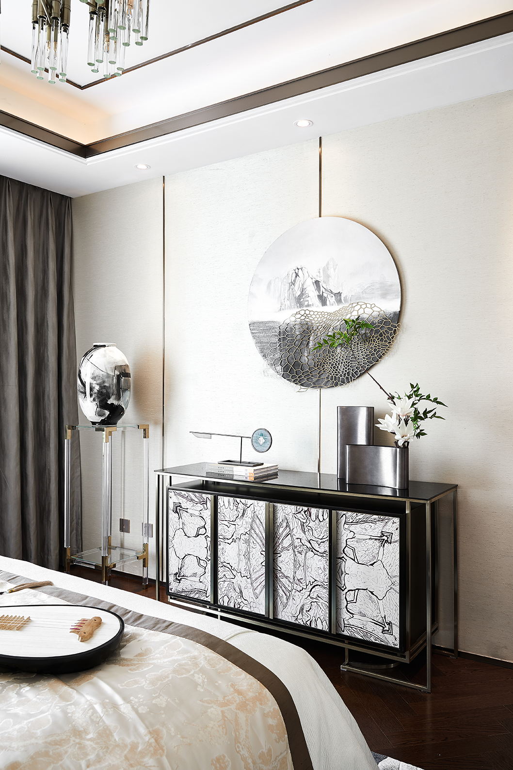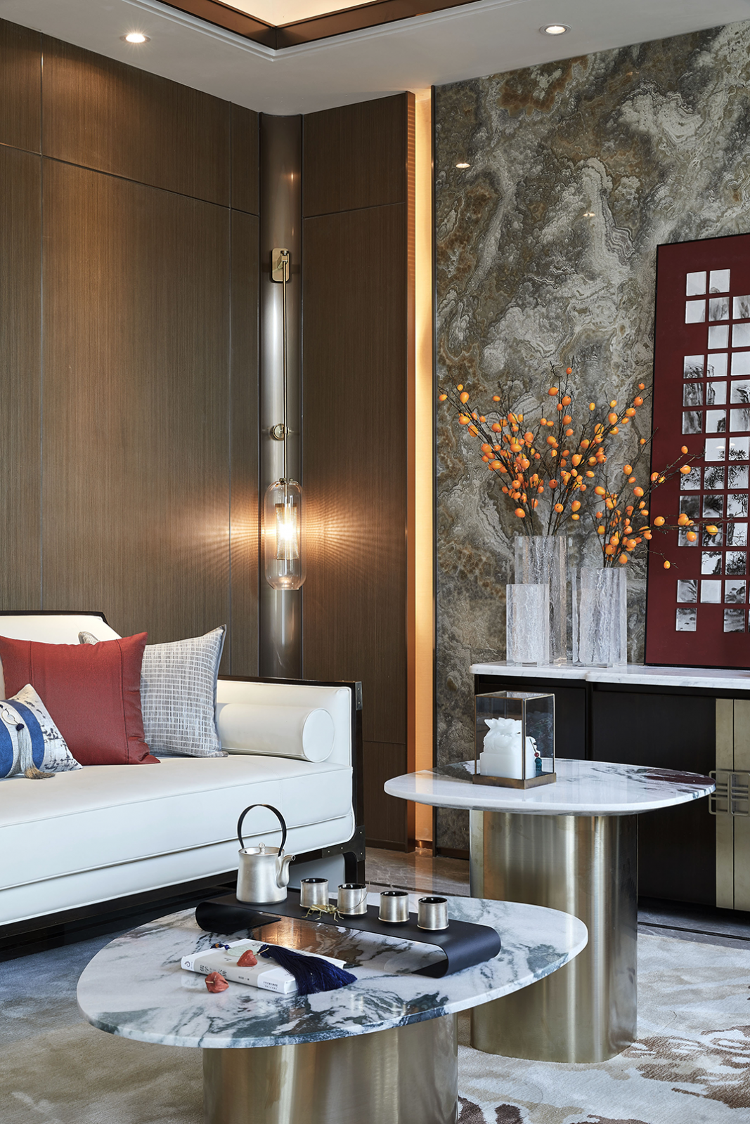 此空间展现“结庐在人境,而无车马喧。问君何能尔”之意境。吊灯以延绵起伏的高山为原型,一展“行到水穷处,坐看云起时”的大气与淡然。
