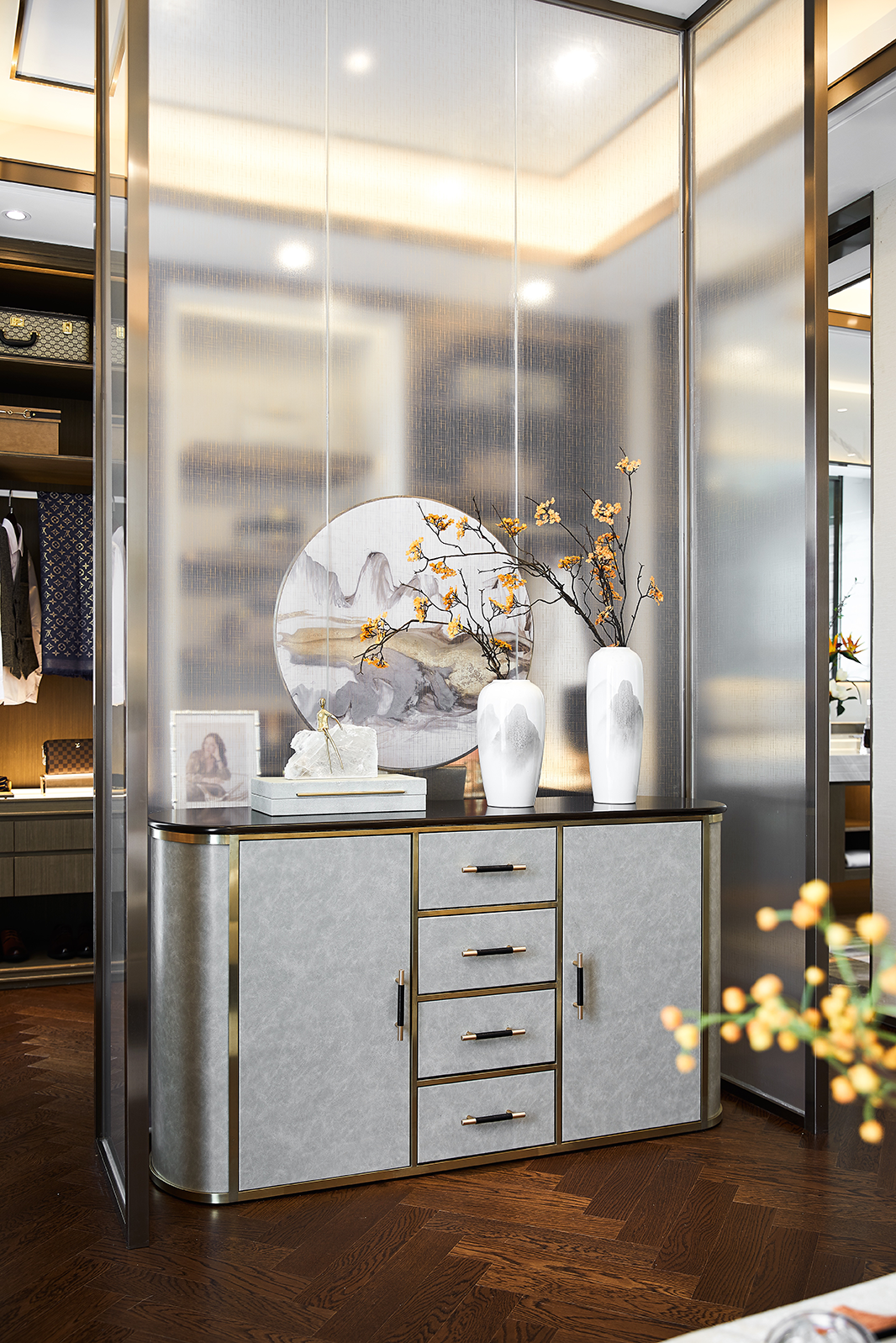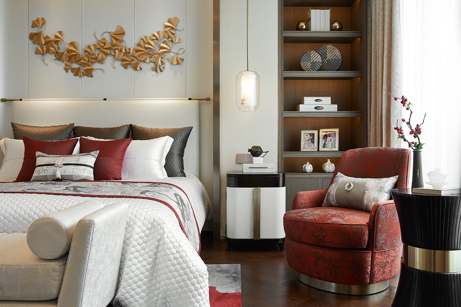 主卧室和衣帽间空间以开放式呈现,主卧背景墙以坚韧和沉着为代表的银杏叶为主题,整个空间依旧以“红”“金”作为点缀,空间物品环环相扣,营造温馨雅致的轻奢质感。