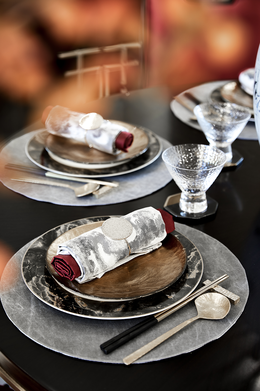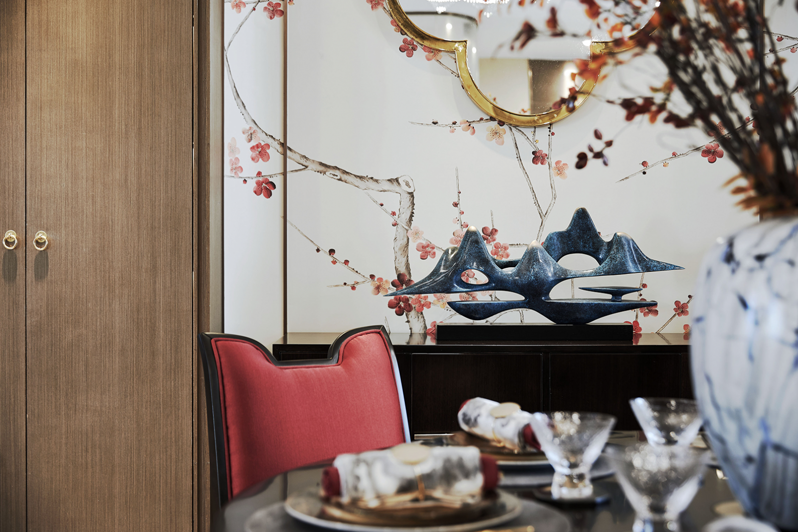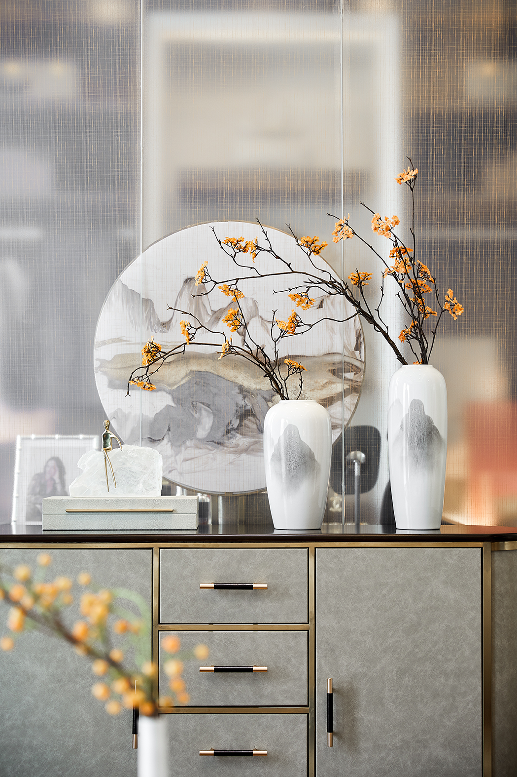 此空间以“水绕青山山绕水,峰峦叠嶂,琉璃如镜,雍荣尔雅,花香四溢”为思路,运用在“吊灯”、“摆件”“器具”“配饰”之中,而梅花五瓣,寓意五福,“快乐,幸福,长寿,顺利,和平”。