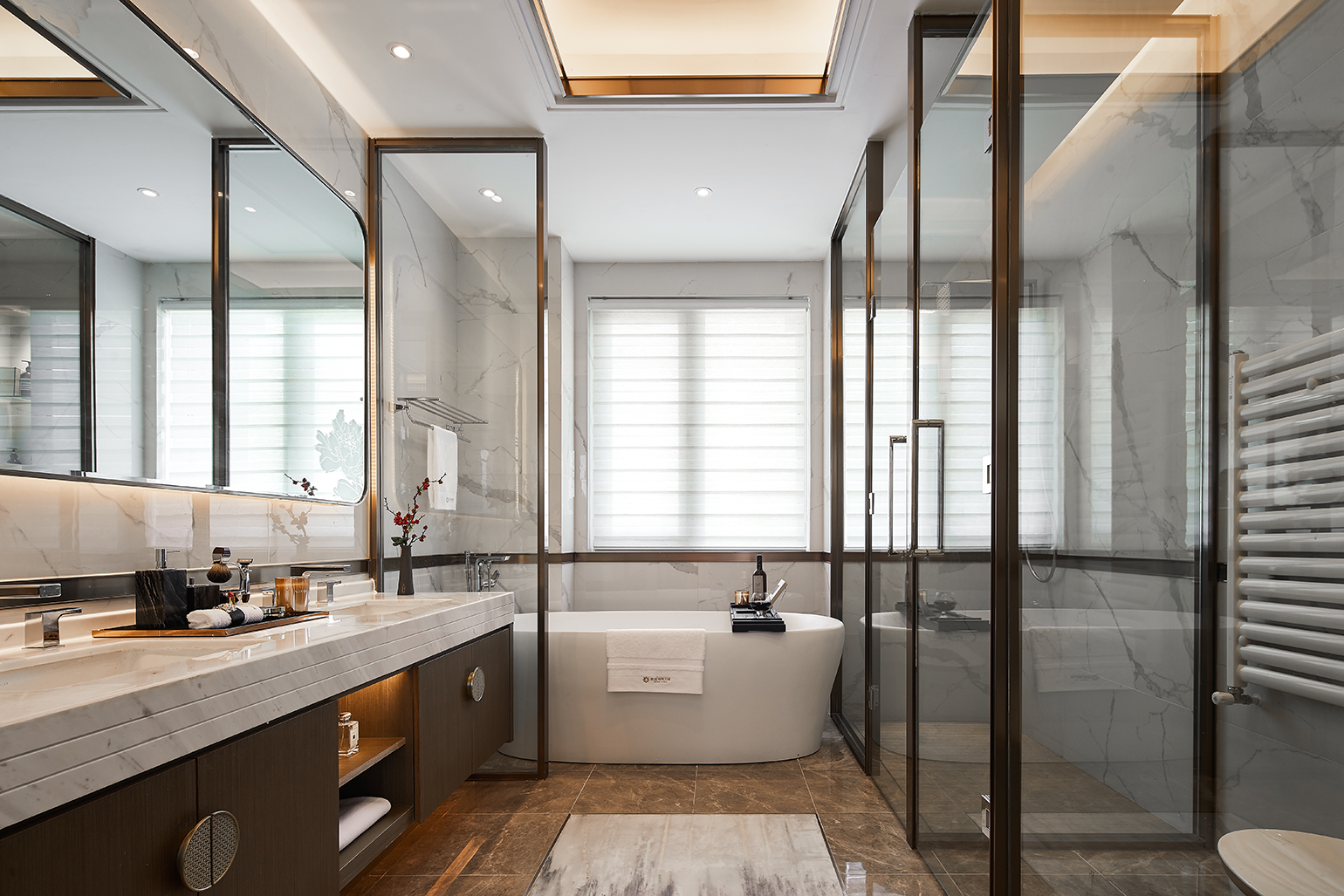 衣帽间和卫生间比邻,无论是石材还是大理石,都是提取“山”元素来作为这个空间的连接,“金”与“白”的搭配显得那么高级。