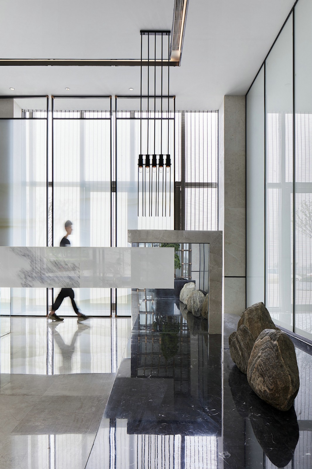 石,作为空间主要元素之一,无论是天然材质、仿真复合材质装置,亦或是水晶玻璃石头吊灯装置,所拥有感性自由的纹路肌理,赋予了空间坚硬沉稳的大气,也丰富了视觉选择,增强人与物的互动感。