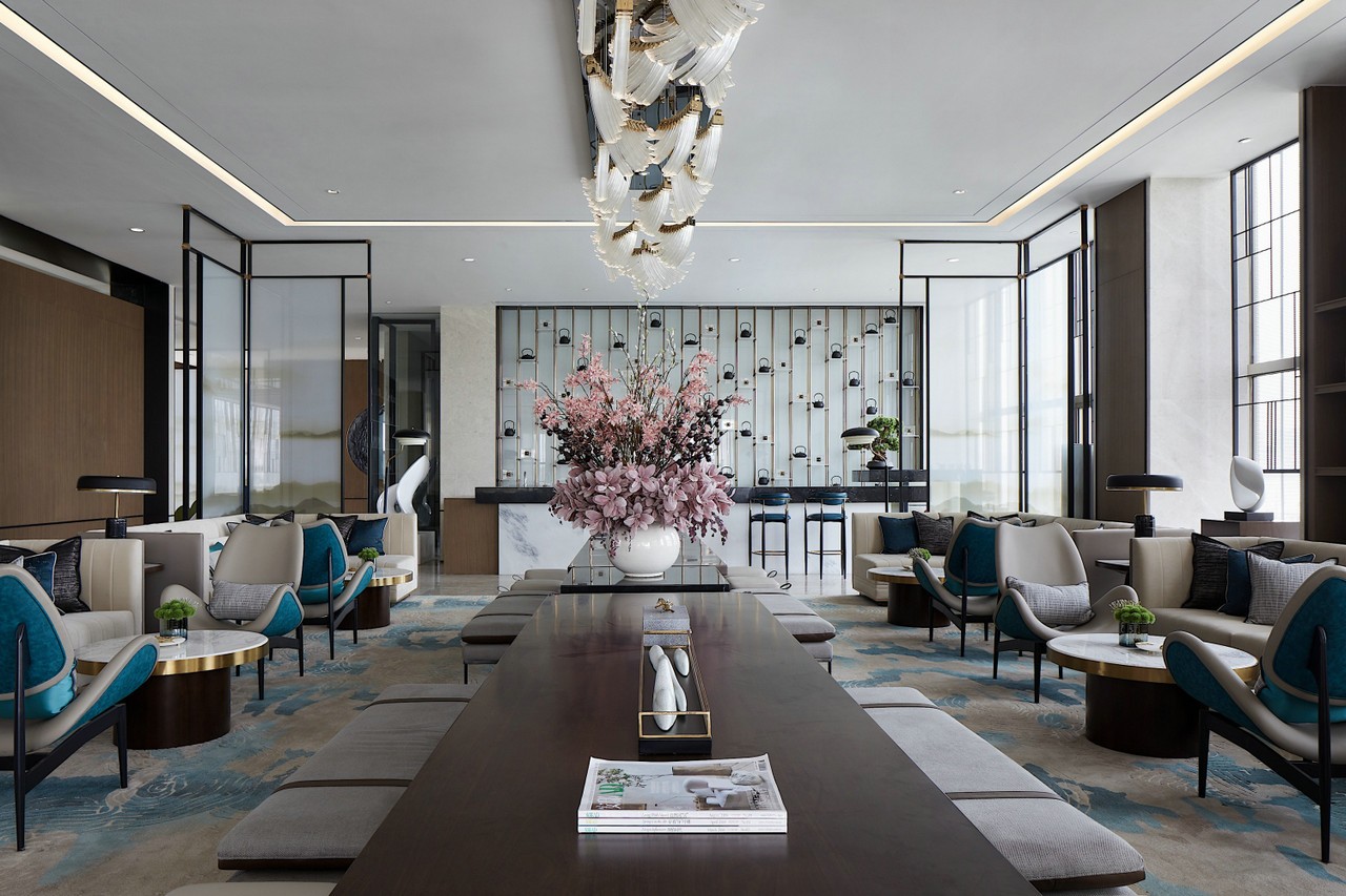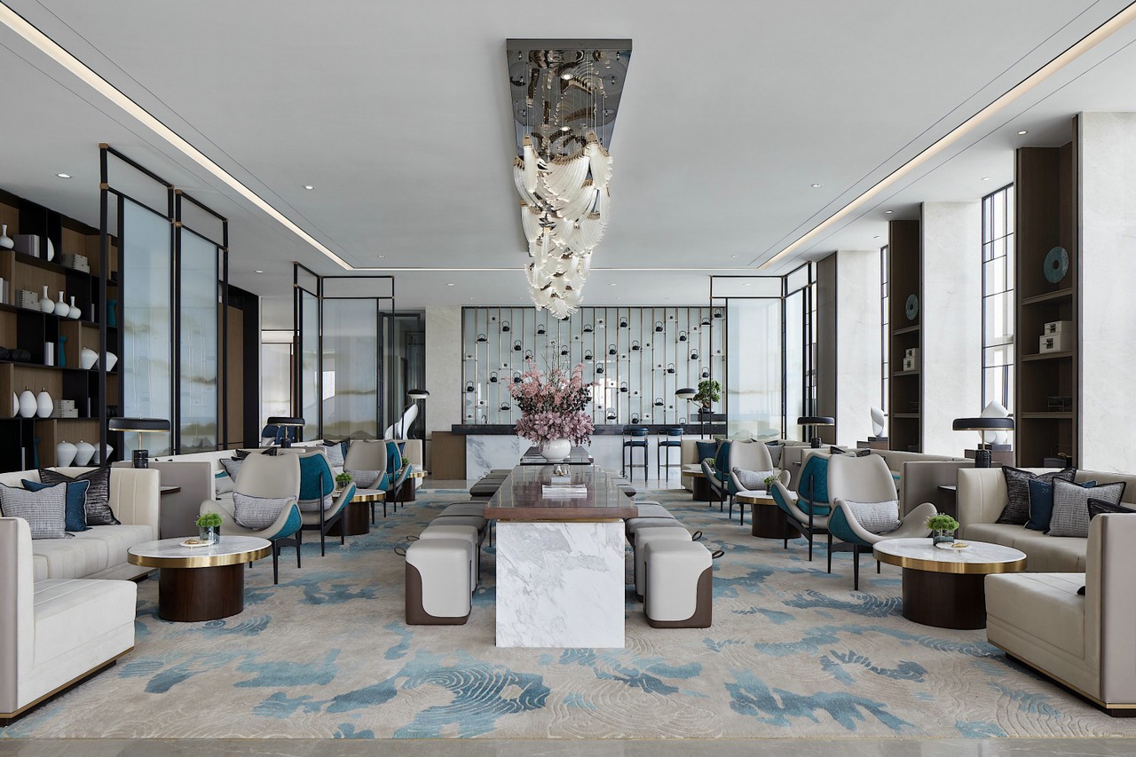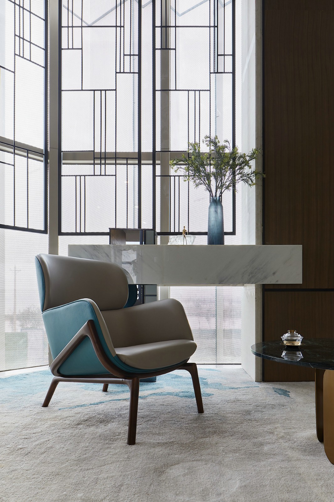 洽谈区上空的羽翼艺术灯饰,象征着流动与生长,用艺术演绎东湖上的白鹭展翅飞翔的姿态,地毯荡起涟漪湖水的意象画面感,给人自由、无限的思维扩展。