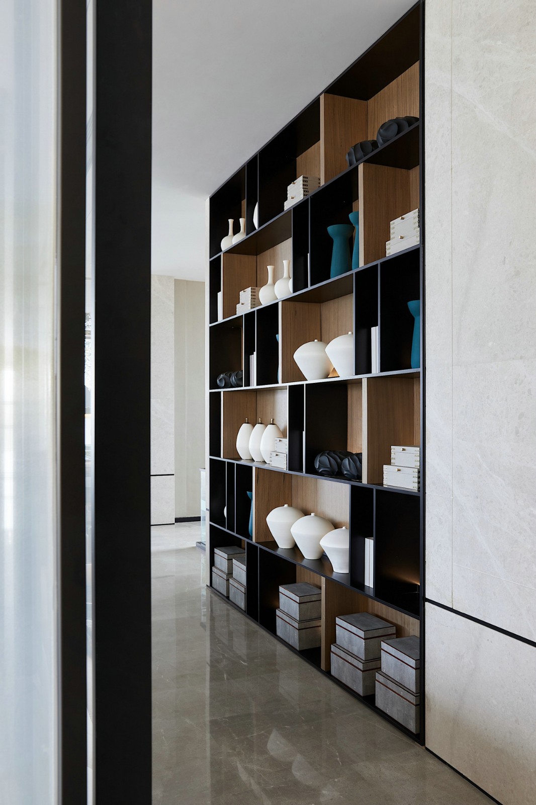 安静舒适的洽谈区所需要的正是这样的氛围空间,但独特也独特在平和,着墨清淡的几笔屏风设计用作隔层,确保区域独立性和私密性,与回廊边上所摆设的精美瓷器交相辉映,颇有江城气韵。