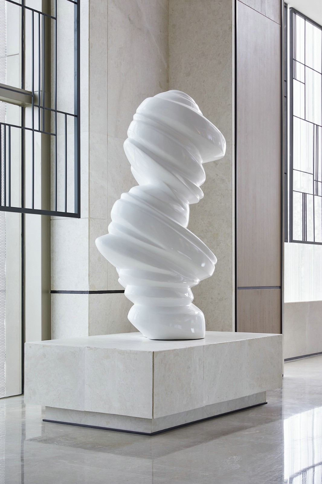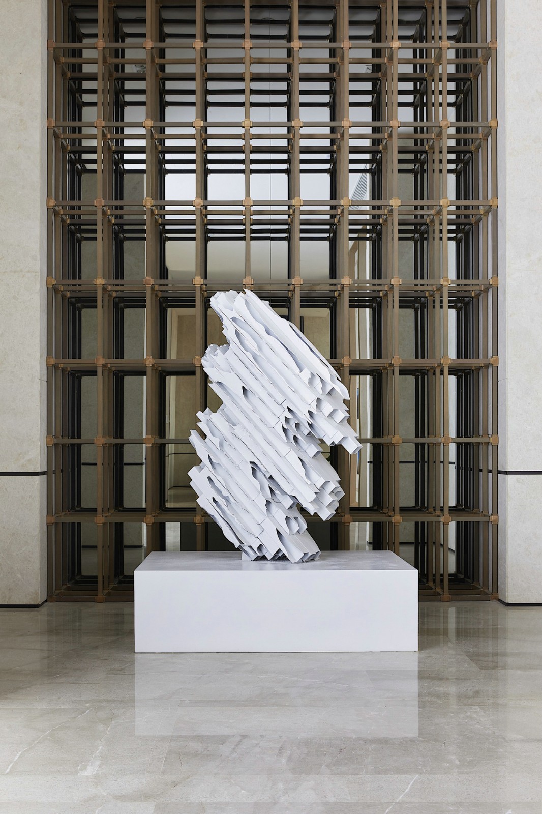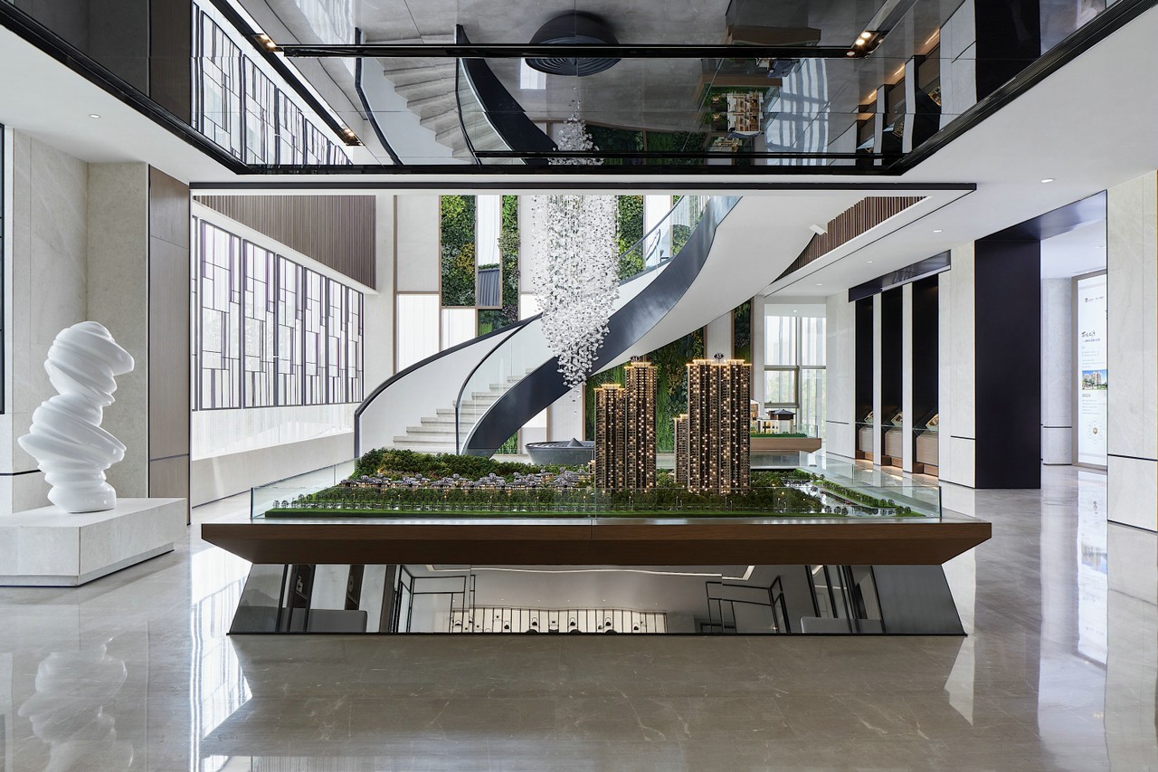 沙盘区整体的软装设计以"空"的方式来展示城市景观,其布局灵活性和大面积窗户的日光穿透,为沙盘区提供了景观价值,且可以让访客在流动的视线中观摩内外。似风似云,如雾又如影的雕塑力量,缓冲了空间的单调。