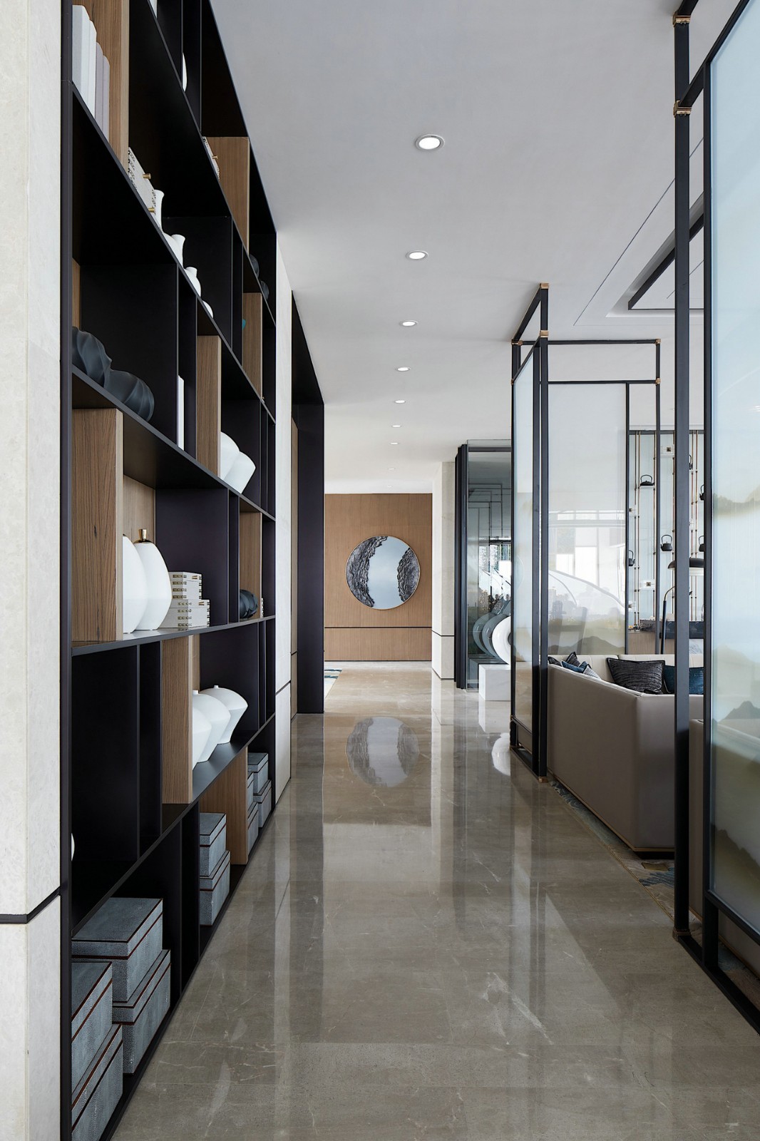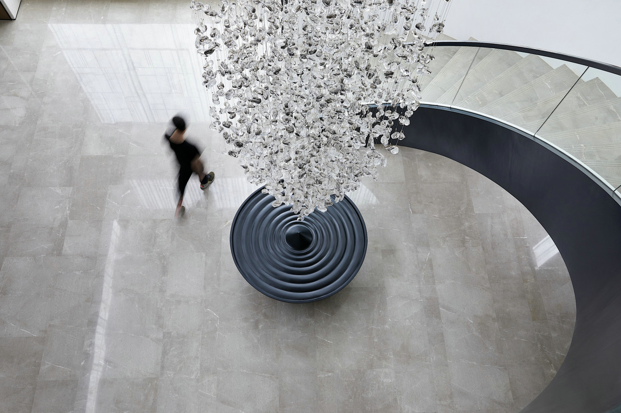 由一层延伸二层的弧形楼梯处,汇聚贯通了整个空间的核心设计理念。大型水晶艺术装置的震撼力,在传统格栅窗隐射的自然光礼貌问候下,动与静交错视觉,提升了空间的艺术美感。