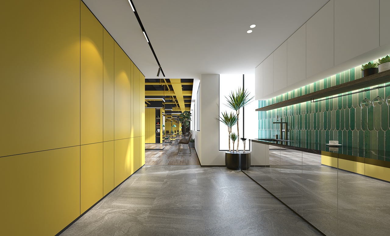 明黄搭配孔雀绿墙砖的茶水间,犹似空间加油站......