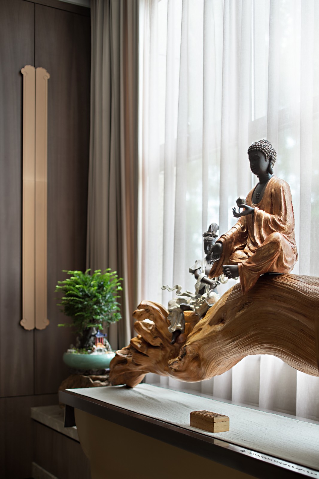居者,礼待天下。宋式官帽椅坐立正中,仪态沉稳端庄,副椅周围环绕有序有章,彰显贵宾礼遇。主椅背景左右对称,有物有序,素雅不失高贵,一巨幅山水画自上而下,为整个空间带来大气磅礴的气势。帘前白纱似透非透,以“空”摄“实”的朦胧里,燃一线香,沏壶好茶,架上藏纳古物雅玩,谈笑风生看沉浮,闲情逸致存高远,何其自在。