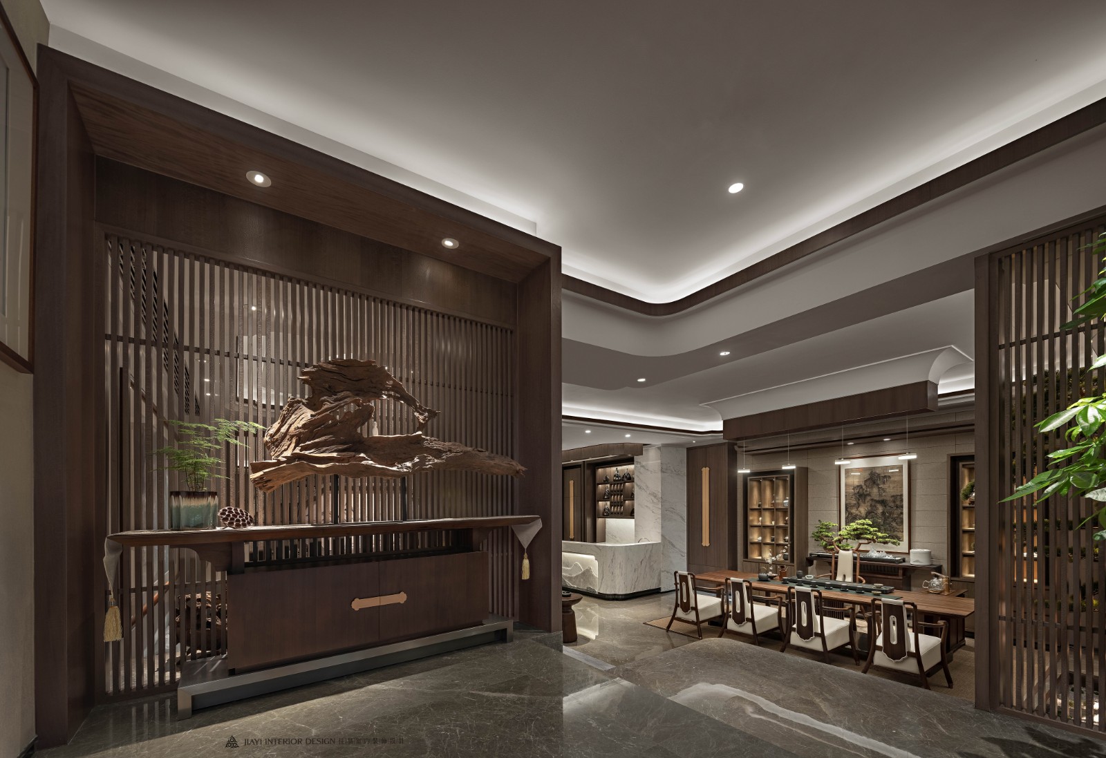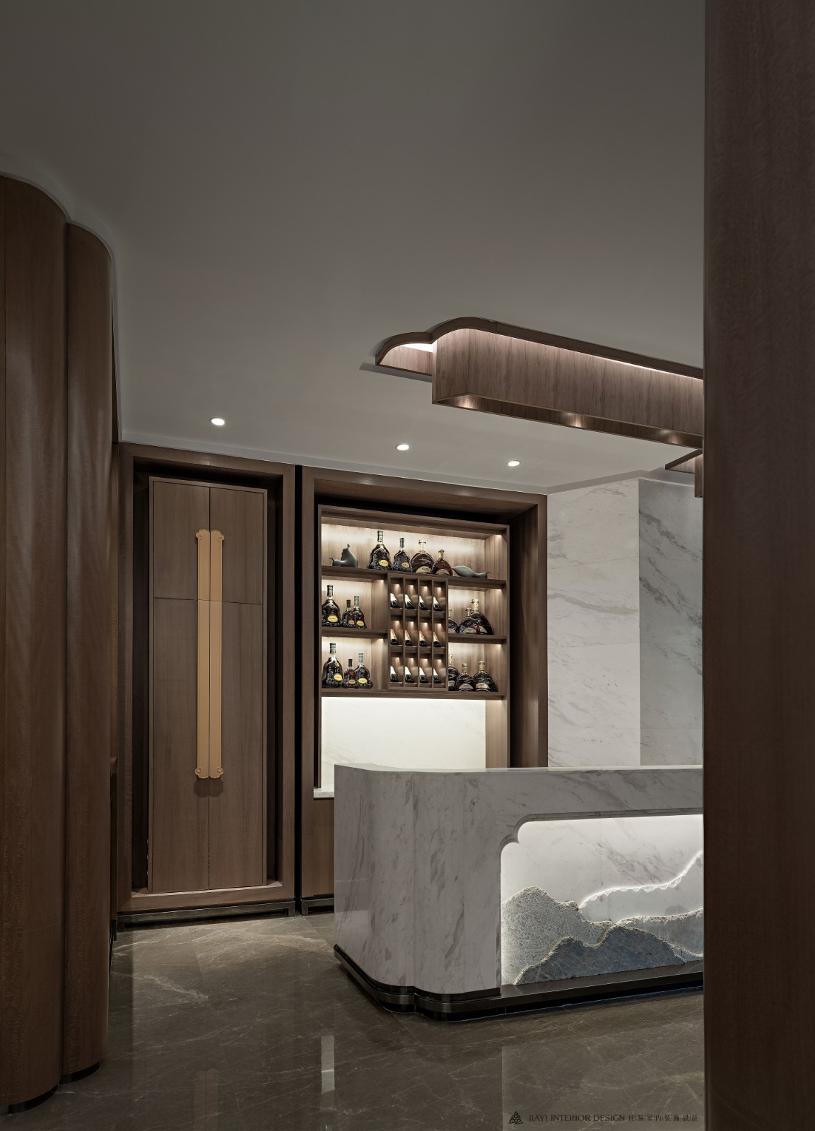 素雅的色调,朴拙的物件,一巨幅山水画悬挂于厅堂,形成了古色古香的灵妙意趣,木制镂空的格栅背景在光线阑珊之间制造空间的变化,巧妙的设计中带着对传统文化精髓的美好追寻。地毯仿若一幅巨大的山水画为整个空间的水墨意象定调,与温润如玉的家具材质相显益彰,在柔和的光照中营造高雅与平和,为文人雅士带来清雅怡然、宁静超凡的空间意境,让心脉的沟通距离再一次被拉近。