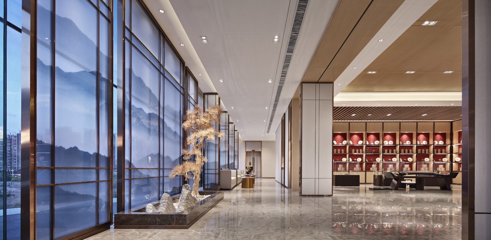 如果说展厅空间是相对硬朗理性的,那在会馆的接待室内,我们更希望它是偏向深谙东方之气韵,为使用者提供一处宁静、舒适的体验场所,于平淡中有惊喜,于回归中有人性温暖。浅金色金属与中式玻璃,传统中式框架下的柜体与案台,现代中式的色彩与材质,在VIP品茶室与会晤室体现着有如谦谦君子的厚重与气质。在VIP室等重要区域的集散地,在整体统一的基调上,不存在呆滞的文化符号,却充盈着墨韵馨香的灵动气息,培养出空间的平衡感和格局观。