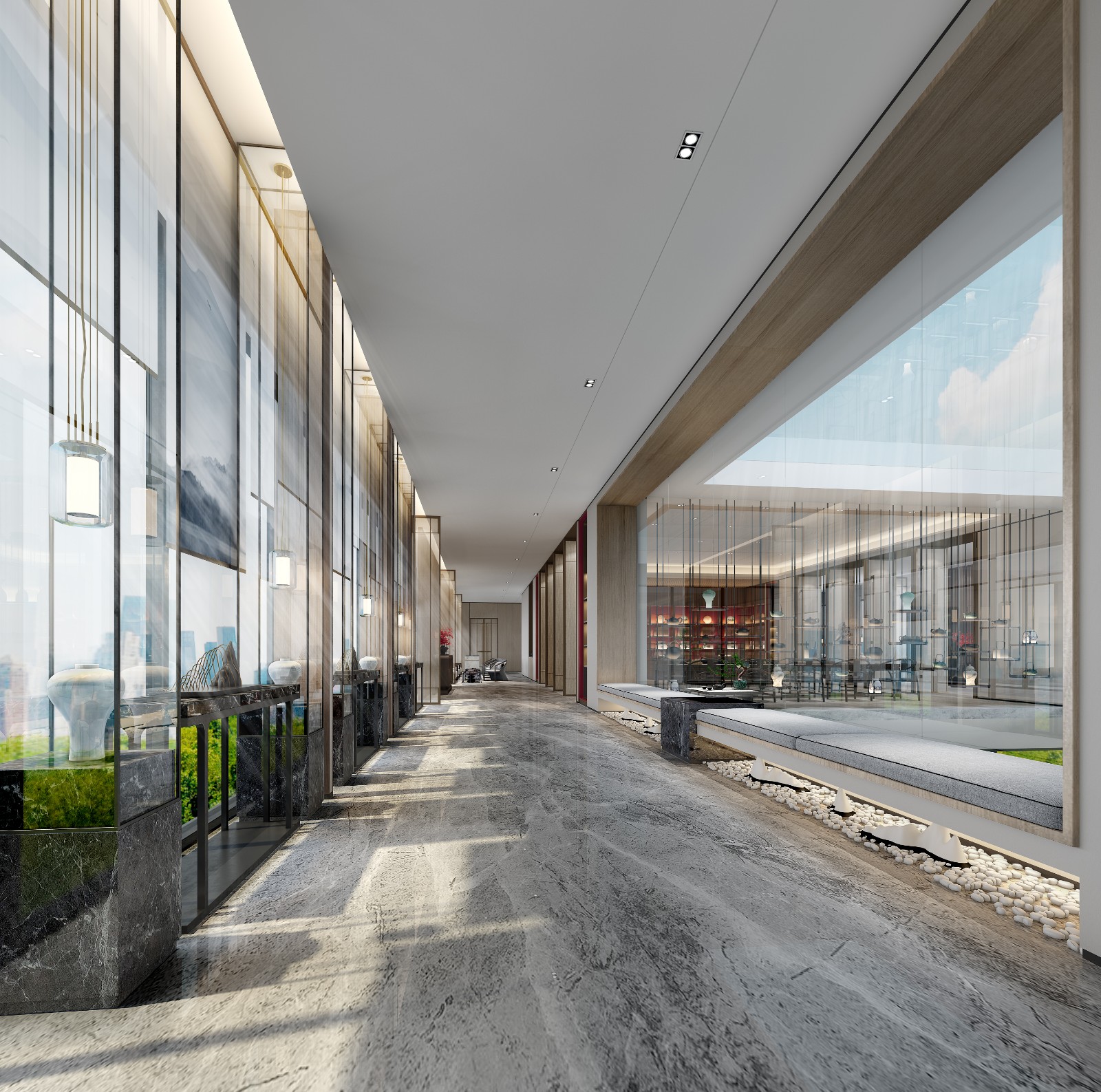 在单向近三十几米的围合型走廊里,以不锈钢金属与山水艺术夹丝玻璃组成的序列屏风,以及屏风与屏风之间形成的序列柱体为节奏,形成清晰而丝毫不凌乱的韵味。金属与山水夹丝玻璃的碰撞,可谓是传统的中式元素与现代的装饰手法水乳交融,巧妙的以现代的设计语言来表达东方的意境。隐去传统中式繁复沉重的设计表现,用减法来表达东方元素。简洁的栏栅屏风配予艺术玻璃,由山水的形态延伸而至,减去具象的形态,点到即止又质感十足。不同的质感、不同的色度摩擦反而使整体感觉刚柔并济,整个空间层次感丰富。