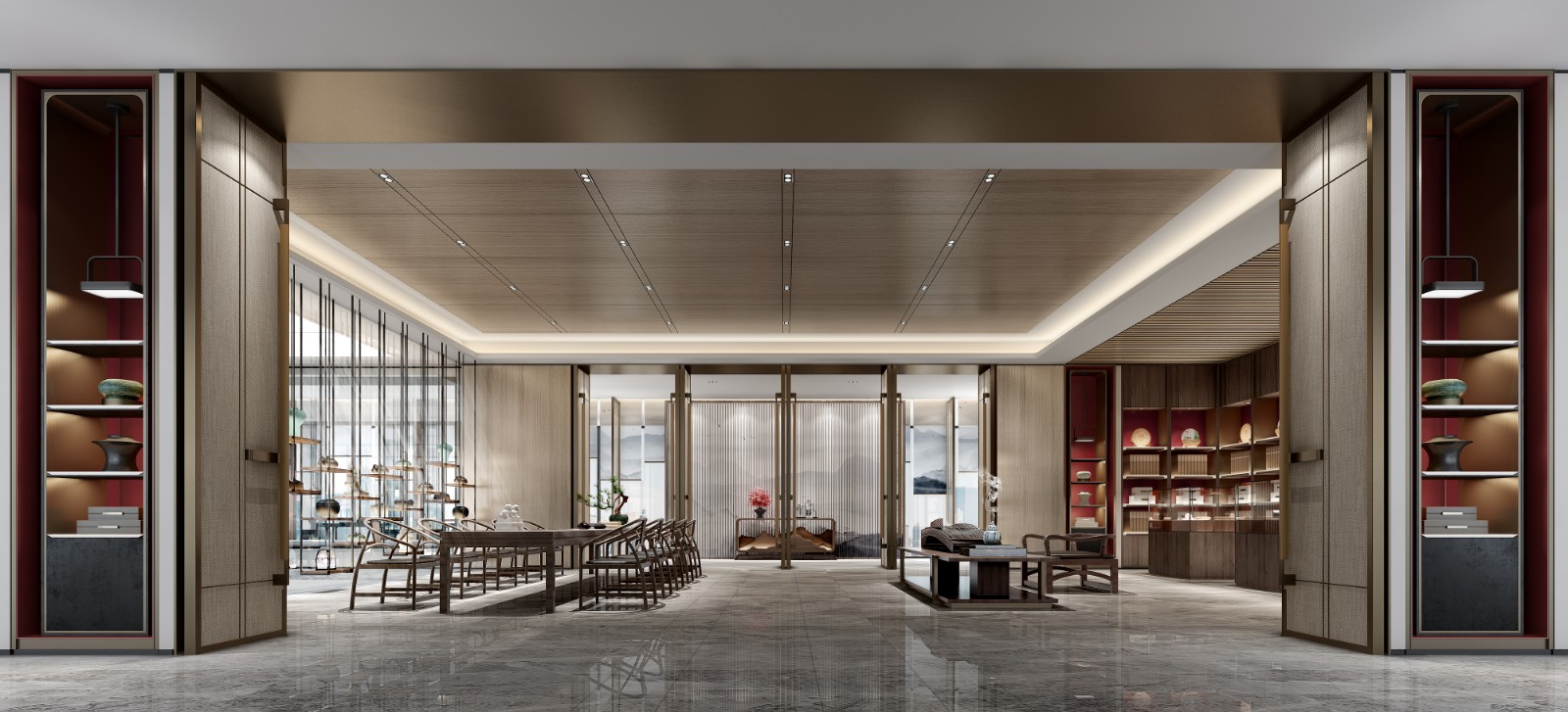 本次设计的现代茶业展厅会馆,不同于茶室、茶会所、茶展厅,它承载着更多的企业使命:展览与品鉴、交流与贸易、商务与会晤如此等等,在此基础上我们更希望这空间从传统中式的内敛、深韵、安静中解放出来,更理性与严谨、更精致与当代。但一定保留的是新中式风格作为东方美学的进化论,它的情结,它君子般的情怀。