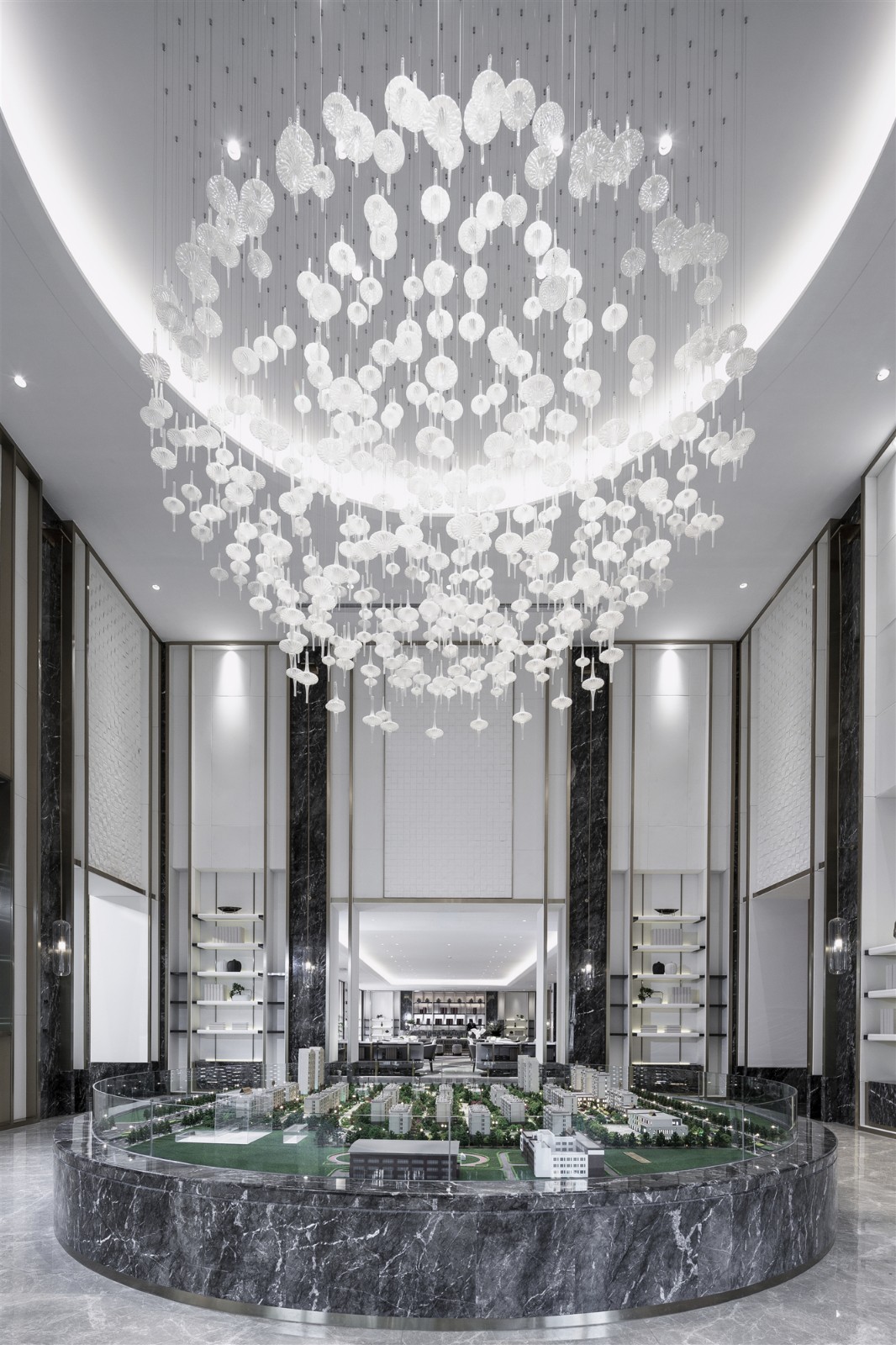 进入售楼处大厅首先印入眼帘的是大型立面装置,它运用了大量的水滴造型经过排列组合形成一个放射状具有张力的大型艺术品。它不仅是水的构成,还包含了若干个散点,散点便是”盐“的演变。