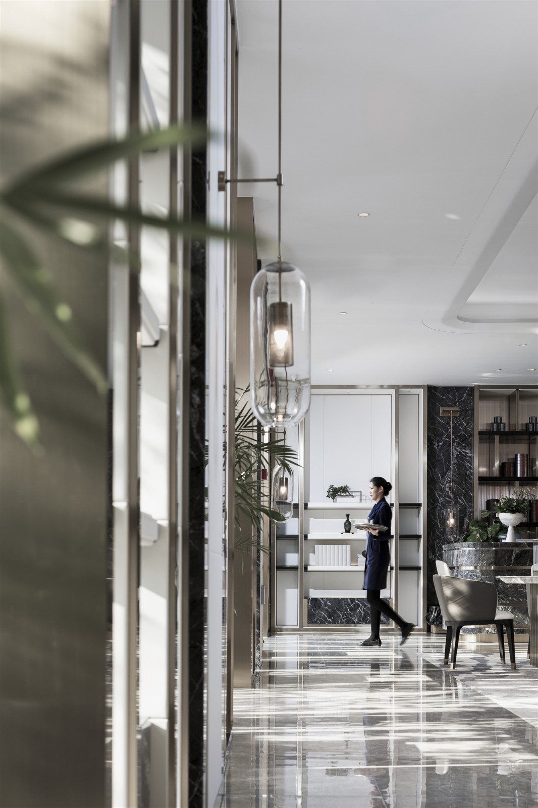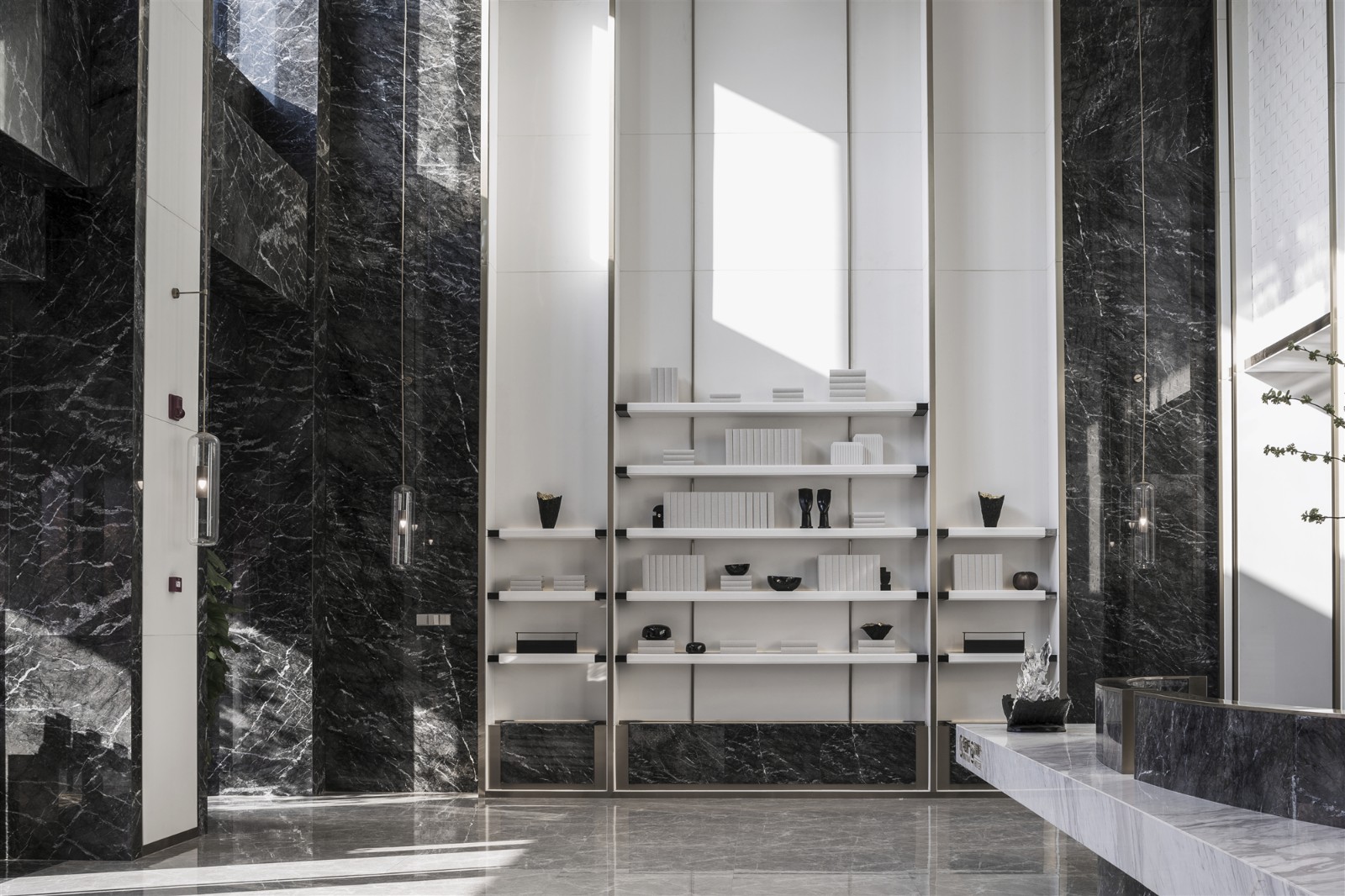空间内部光影交织,层次丰富。空间中石材,金属,皮革,玻璃交相呼应,体现出整体的品质感。
