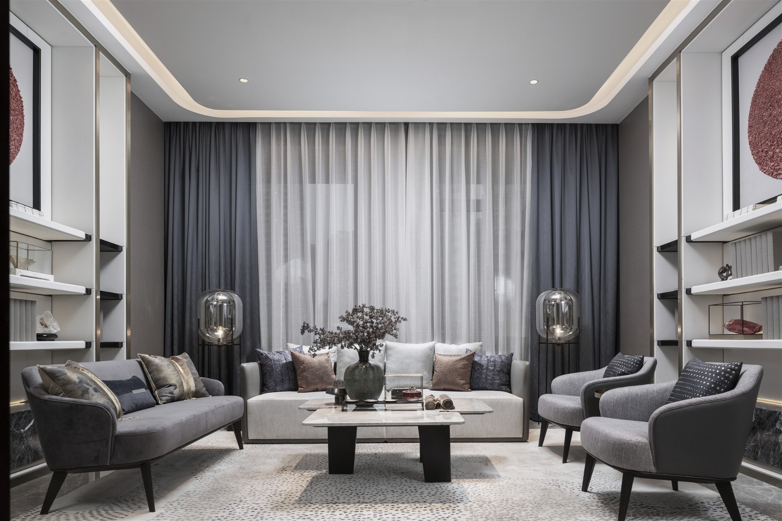 沙盘区四周立面非常简练,书籍和陈设品相互穿插,沙盘区上方的水滴形吊饰成为此空间的亮点,呼应空间主体并提升了整个空间的格调。