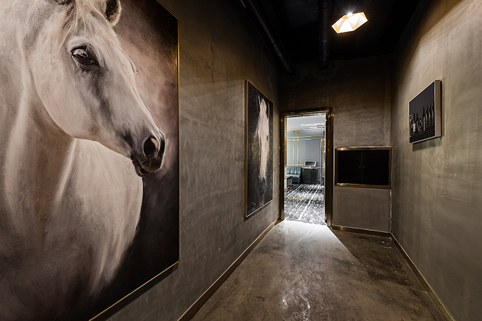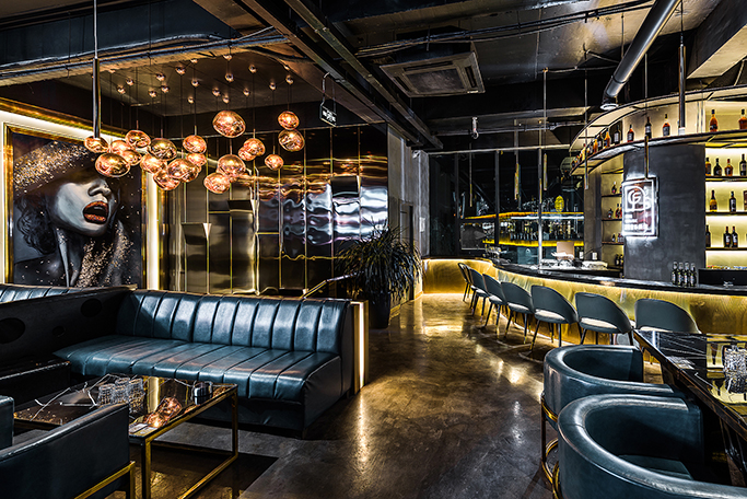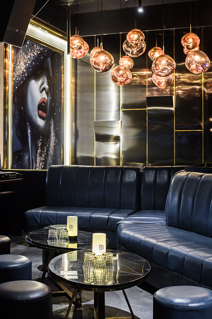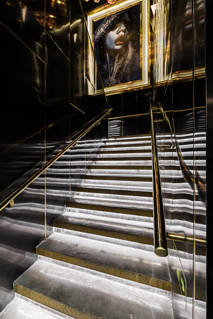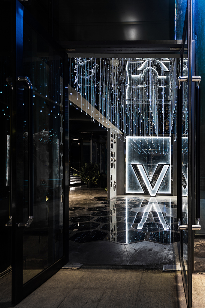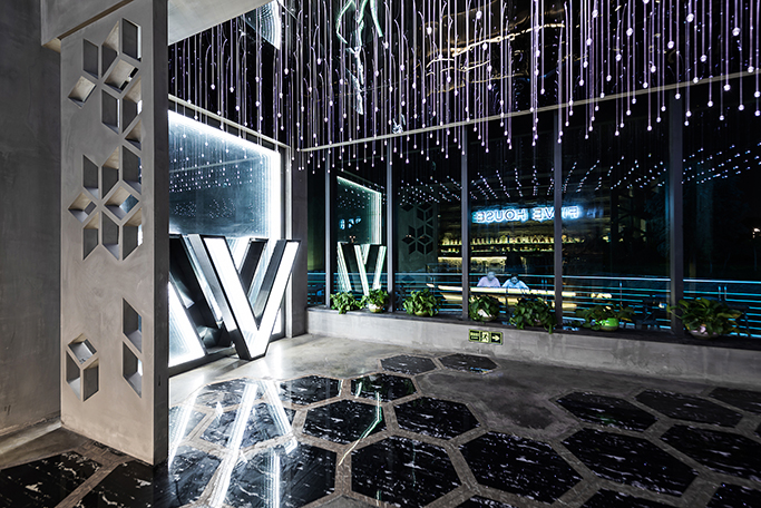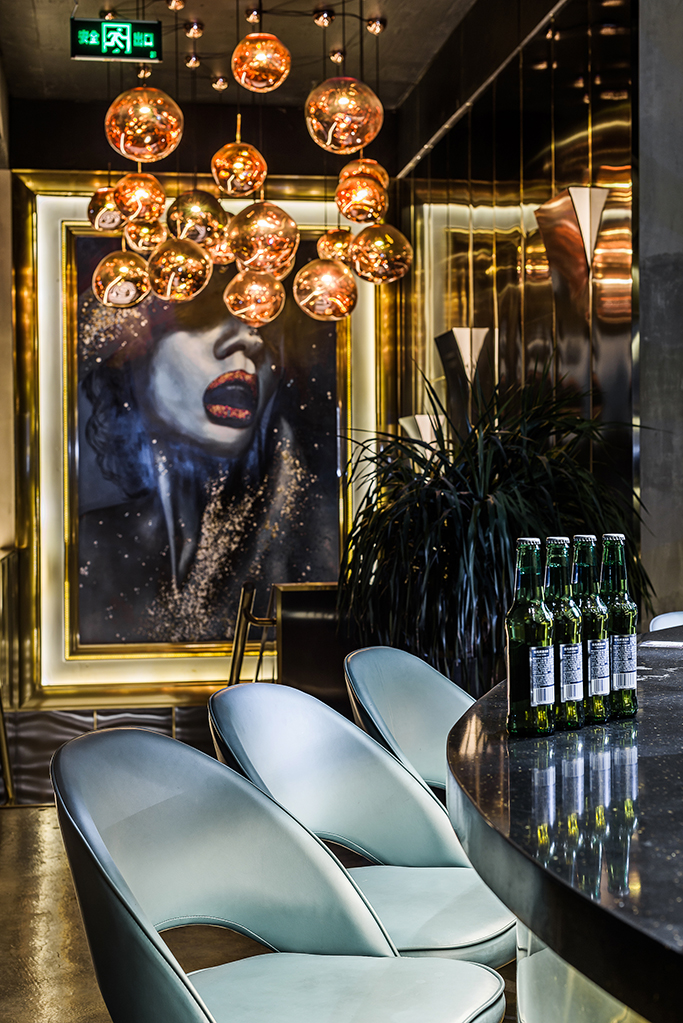 二层入口处采取了开放型的设计,以简单的几何状半圆围出通高的金属酒柜。休闲散座区以沙发组搭配散桌的形式布置,空间上与舞台区形成呼应。两侧用铁丝焊的音响,伴随着发光的字体墙,给舞台以极强的律动感。本案的整体设计均以简单的方式,带来强烈震撼。就像90年代后期,流行于中国的朋克,用没心没肺的方式来解构这些复杂的老世界。