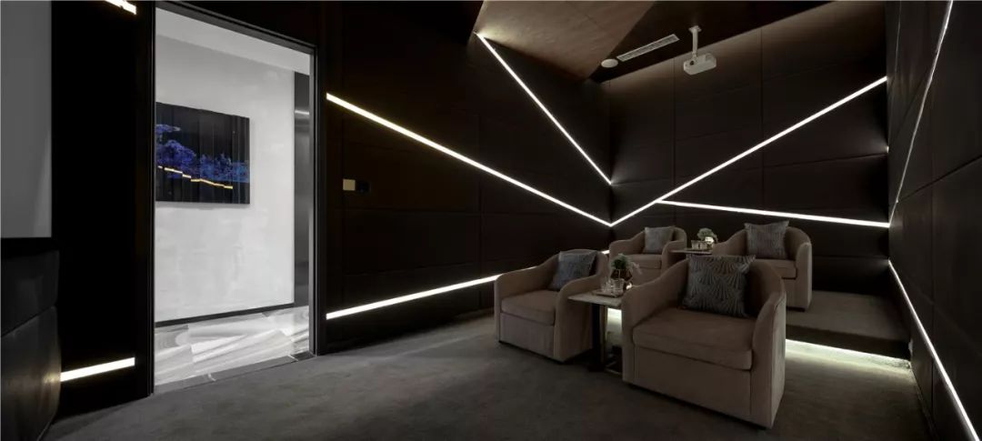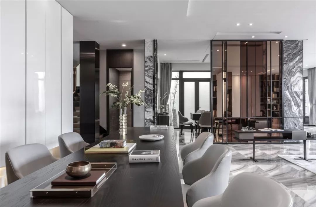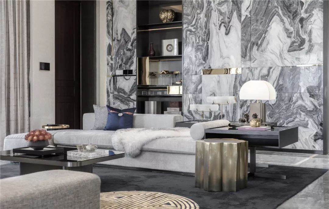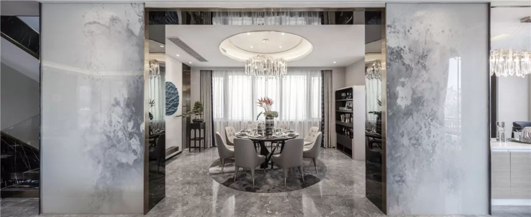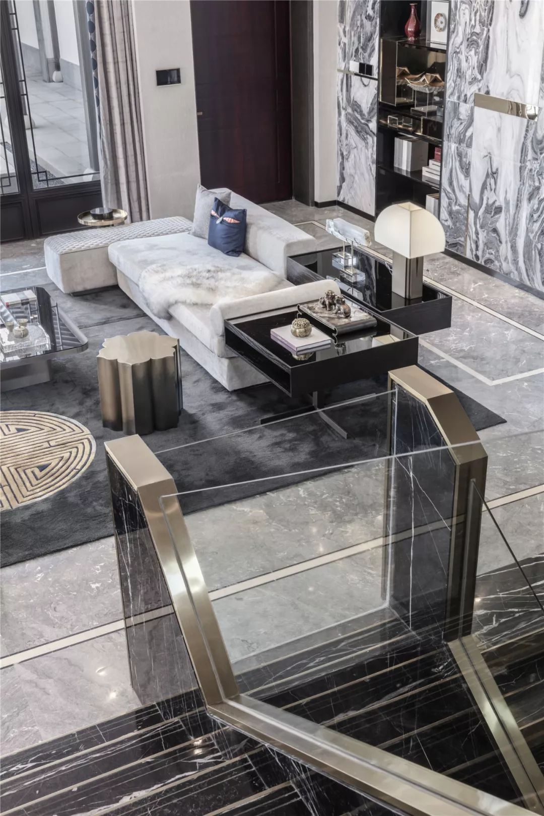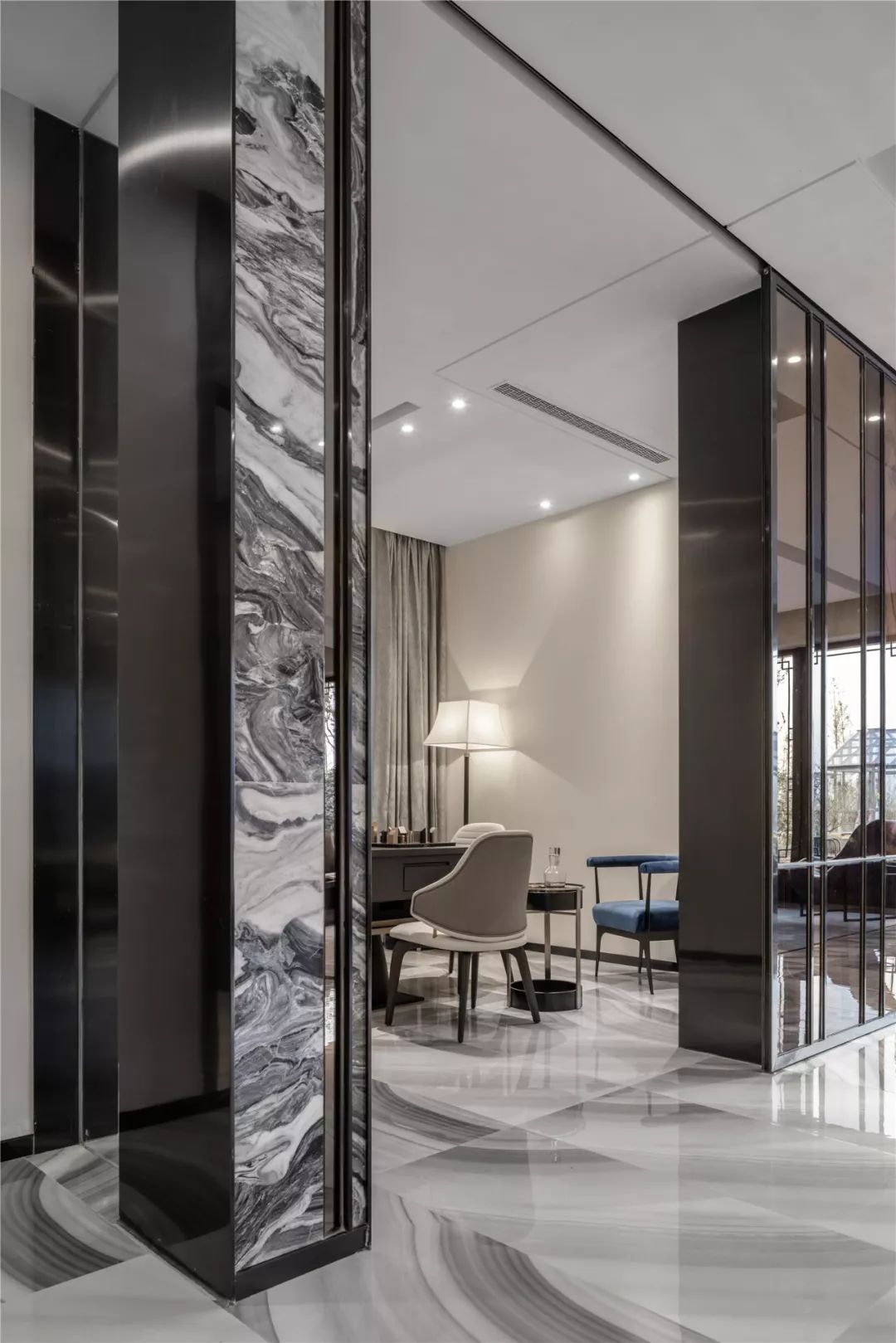 “竖画三寸,当千仞之高,横墨数尺,体百里之迥。”设计师将肌理各异的石材铺陈于多处空间,渲染出浓郁的东方水墨意象。“自山下而仰山巅谓之高远;自山前而窥山后谓之深远;自近山而望远山谓之平远。”中国山水画的审美观感,溢于细节之上。